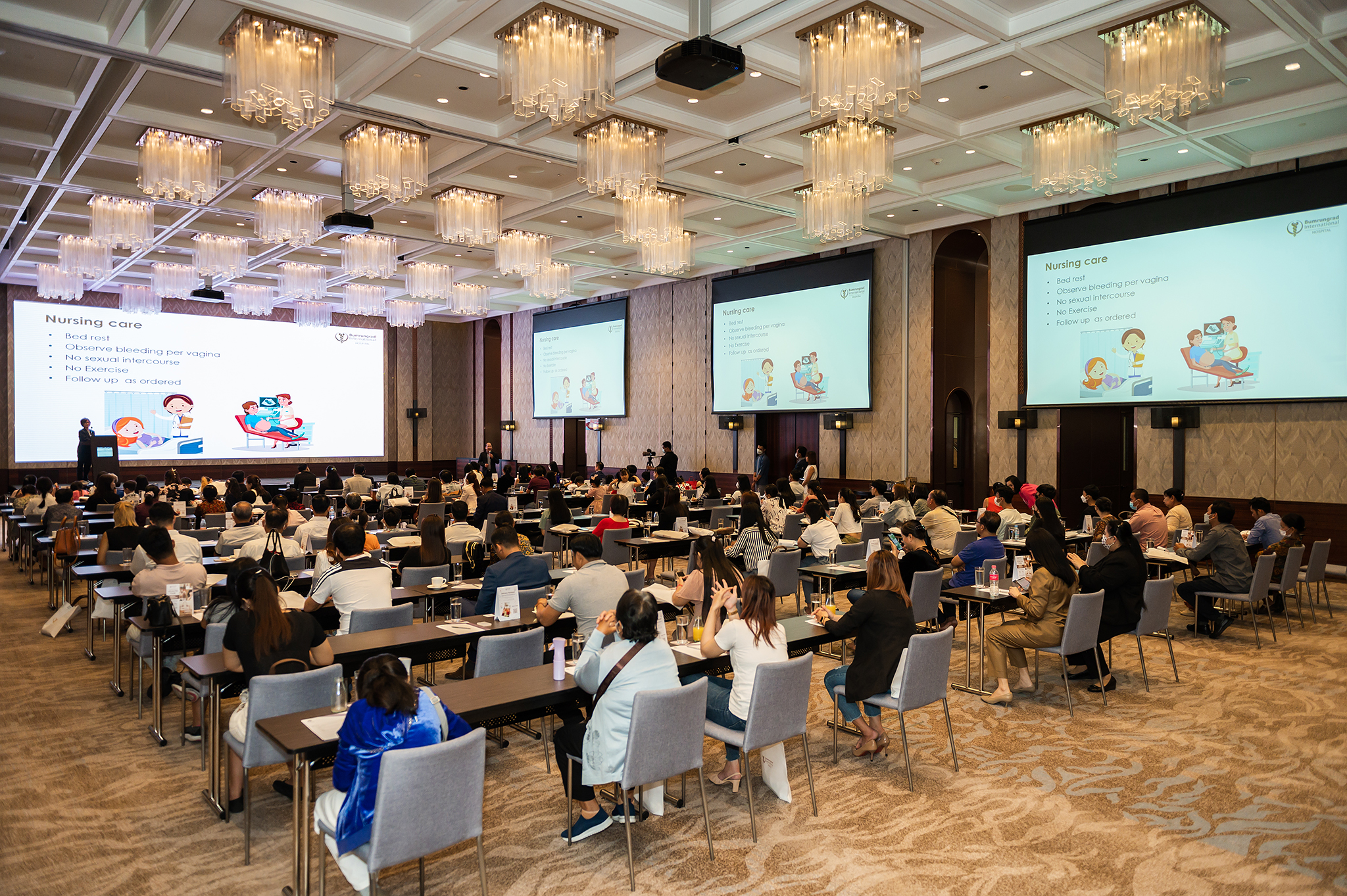 ក្រុមការងារ Bumrungrad ពិតជាមានសេចក្តីសោមនស្សរីករាយណាស់ ក្នុងការរៀបចំឲ្យមានពិព័រណ៍សុខភាពឆ្នាំ ២០២២ នេះ។ លោកវេជ្ជបណ្ឌិត Dr. Nipat Kulabkaw ប្រធានផ្នែកអភិវឌ្ឍន៍អាជីវកម្ម រួមនឹងក្រុមការងារ បានរៀបចំឲ្យមានជាបទបង្ហាញជាច្រើនពីសំណាក់ក្រុមអ្នកជំនាញផ្នែកសុខភាព។ លោកវេជ្ជបណ្ឌិត Somsri Pitukkijronnakorn ឯកទេសសម្ភព-រោគស្ត្រី និងជាអ្នកឯកទេសផ្នែកវេជ្ជសាស្ត្រមាតា និងទារក បង្ហាញគ្រប់ទិដ្ឋភាពនៃការថែទាំសុខភាពសម្រាប់ការមានផ្ទៃពោះ រួមទាំងការមានផ្ទៃពោះដែលមានហានិភ័យខ្ពស់ដោយ សារតែអសមត្ថភាពមាត់ស្បូន និងការសម្រាលកូនមិនទាន់គ្រប់ខែជាដើម។ ជាងនេះទៅទៀត លោកវេជ្ជបណ្ឌិត Wattanaphol Phipathananunth គ្រូពេទ្យឯកទេសជំងឺបេះដូង ក៏បានចូលរួមចែករំលែកចំណេះដឹង និងបទពិសោធន៍ក្នុងការព្យាបាលជំងឺបេះដូងផងដែរ។ លោកវេជ្ជបណ្ឌិត Pakpilai Thavisin ឯកទេសឱសថប្រឆាំង និងបង្ការភាពចាស់ មកពីមជ្ឈមណ្ឌលសុខភាពវិទ្យាសាស្ត្រ VitalLife បានចែករំលែកអំពីវិធីធ្វើឱ្យមានសុខភាពល្អពីខាងក្នុងរាងកាយ។