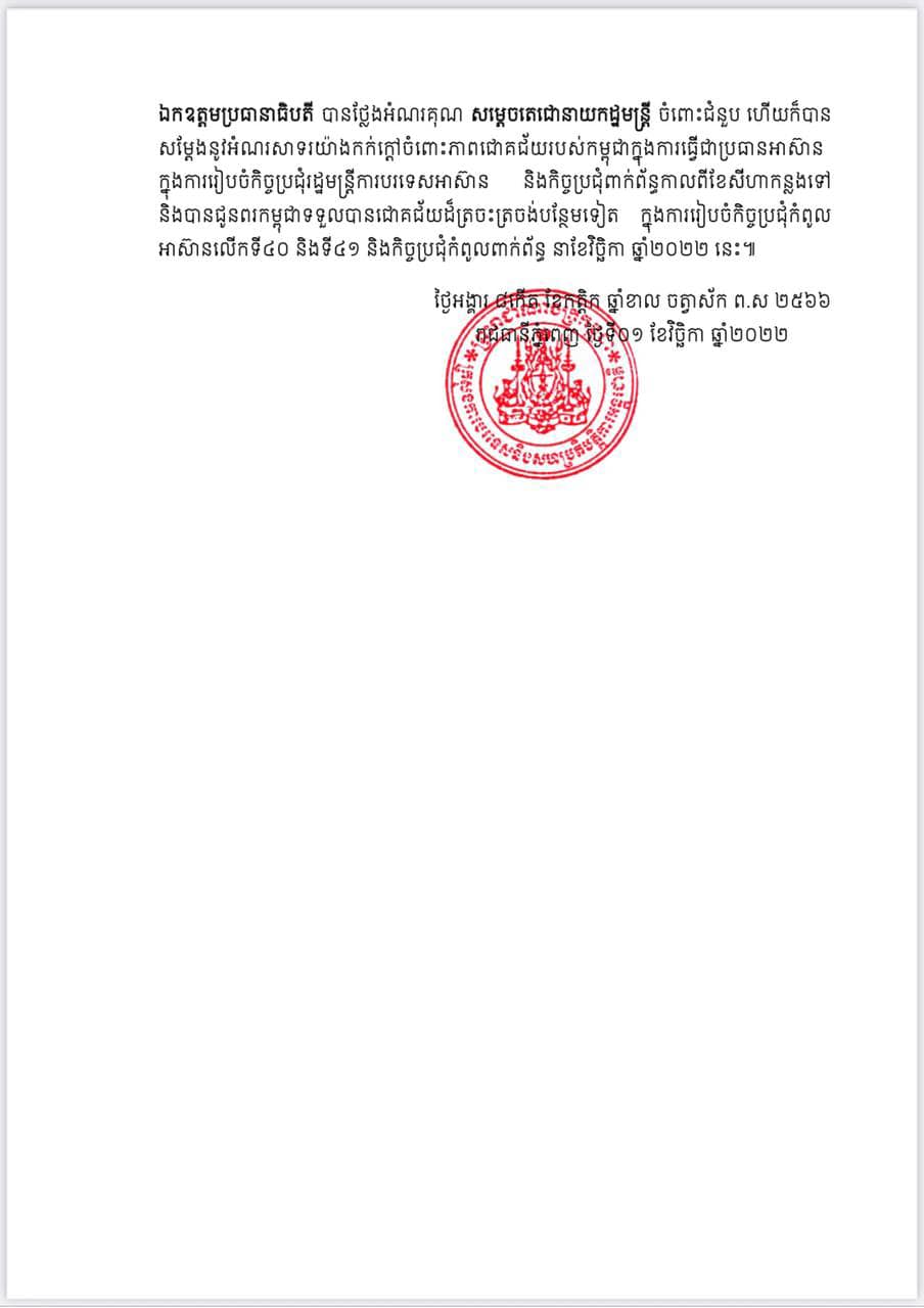 ឯកឧត្តមប្រធានាធិបតី ហ្ស៊ែលឡិនស្គី បានថ្លែអំណរគុណ និងស្វាគមន៍ចំពោះកម្ពុជា ដែលមានបំណងផ្គល់ជំនួយខាងលើដោះមីននេះ។ ឯកឧត្តមប្រធានាធិបតី ហ្ស៊ែលឡិនស្គី ក៏បានអញ្ជើញសម្តេចតេជោនាយករដ្ឋមន្ត្រី ទៅបំពេញទស្សនកិច្ចនៅអ៊ុយក្រែនតាមពេលសមស្រប ៕