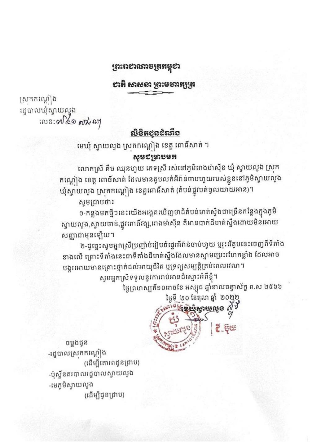 ចំពោះករណីនេះ អាជ្ញាធរមានសមត្ថកិច្ចបានអះអាងថា មកពីម្ចាស់តូបមិនសហការចូលរួម តាមរយៈការជូនដំណឹងរបស់អាជ្ញាធរឃុំ ទាក់ទងនឹងស្ថានភាពបាក់ច្រាំងគួរឱ្យព្រួយបារម្មណ៍ កាលពីថ្ងៃទី២០ ខែតុលា ឆ្នាំ២០២២។