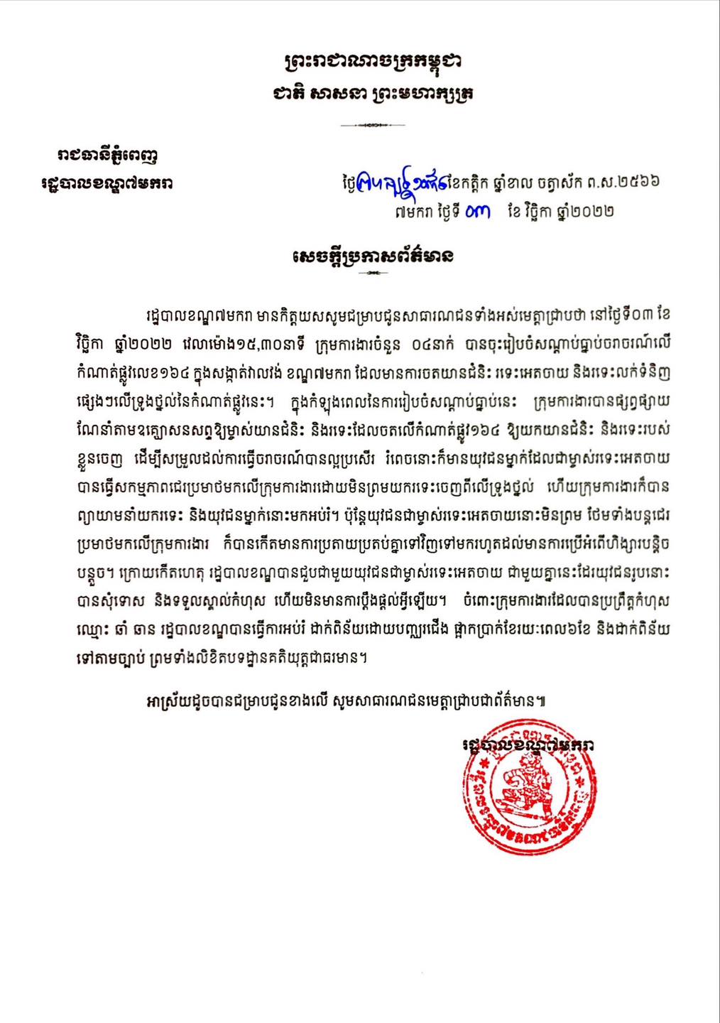 រដ្ឋបាលខណ្ឌ៧មករា ធ្វើការបកស្រាយករណីអាជ្ញាធរប្រើហិង្សាលើម្ចាស់រទេះអេតចាយ និងធ្វើការដាក់ពិន័យមន្ត្រីរូបនោះ ដោយបញ្ឈរជើង ផ្អាកប្រាក់ខែរយៈពេល៦ខែ និងដាក់ពិន័យទៅតាមច្បាប់ (មានវីដេអូ)