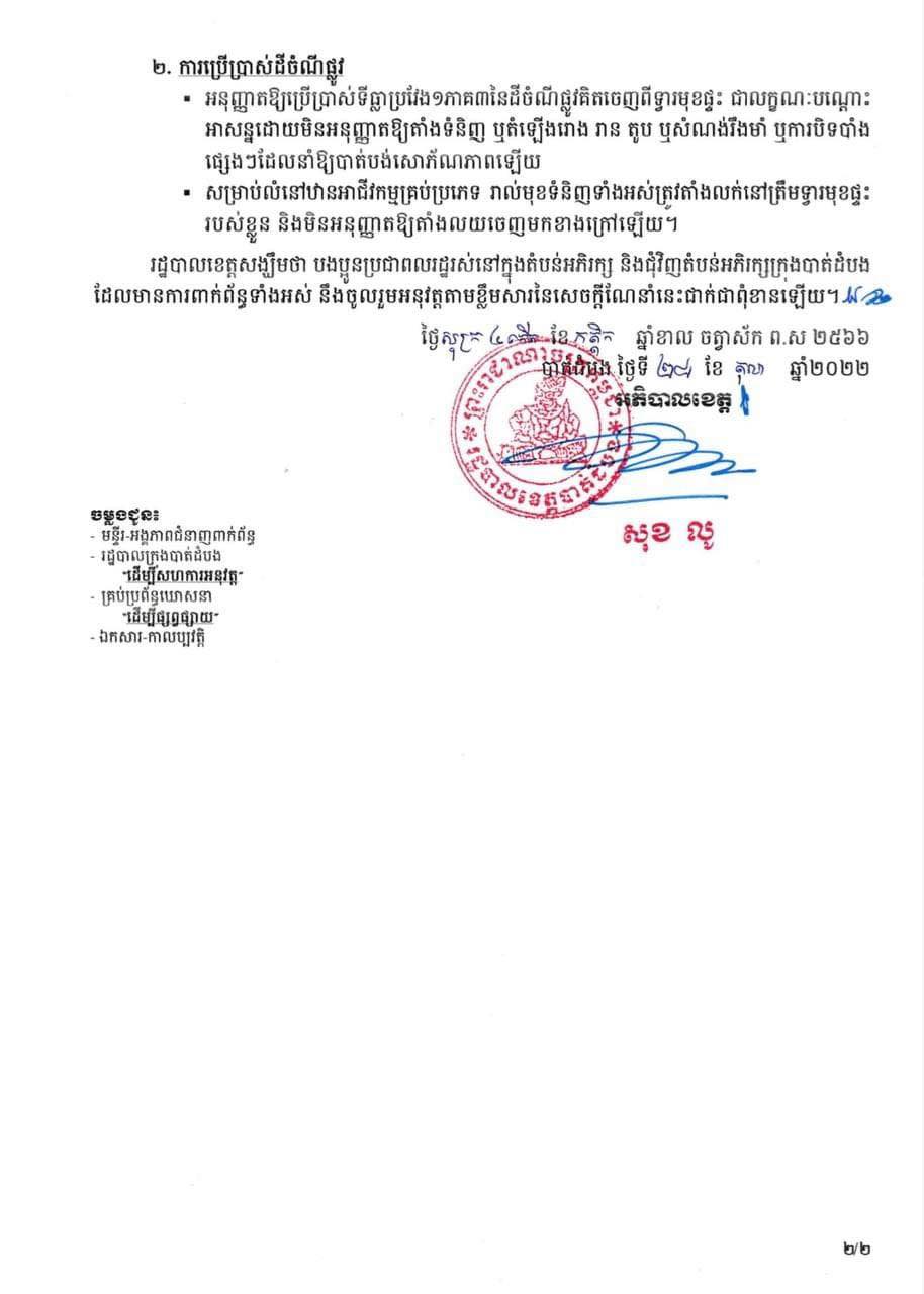 ខេត្តបាត់ដំបង៖ យោងតា​មការចុះផ្សាយរបស់ រដ្ឋបាលខេត្តបាត់ដំបង នៅថ្ងៃទី០៤ ខែវិច្ឆិកា ឆ្នាំ២០២២ បានចេញសេចក្តីណែនាំ ស្តីពី ការរៀបចំតាំងស្លាកយីហោ និងការប្រើប្រាស់ដីចំណីផ្លូវ នៅក្នុងតំបន់អភិរក្ស និងជុំវិញតំបន់អភិរក្ស ក្រុងបាត់ដំបង ខេត្តបាត់ដំបង។