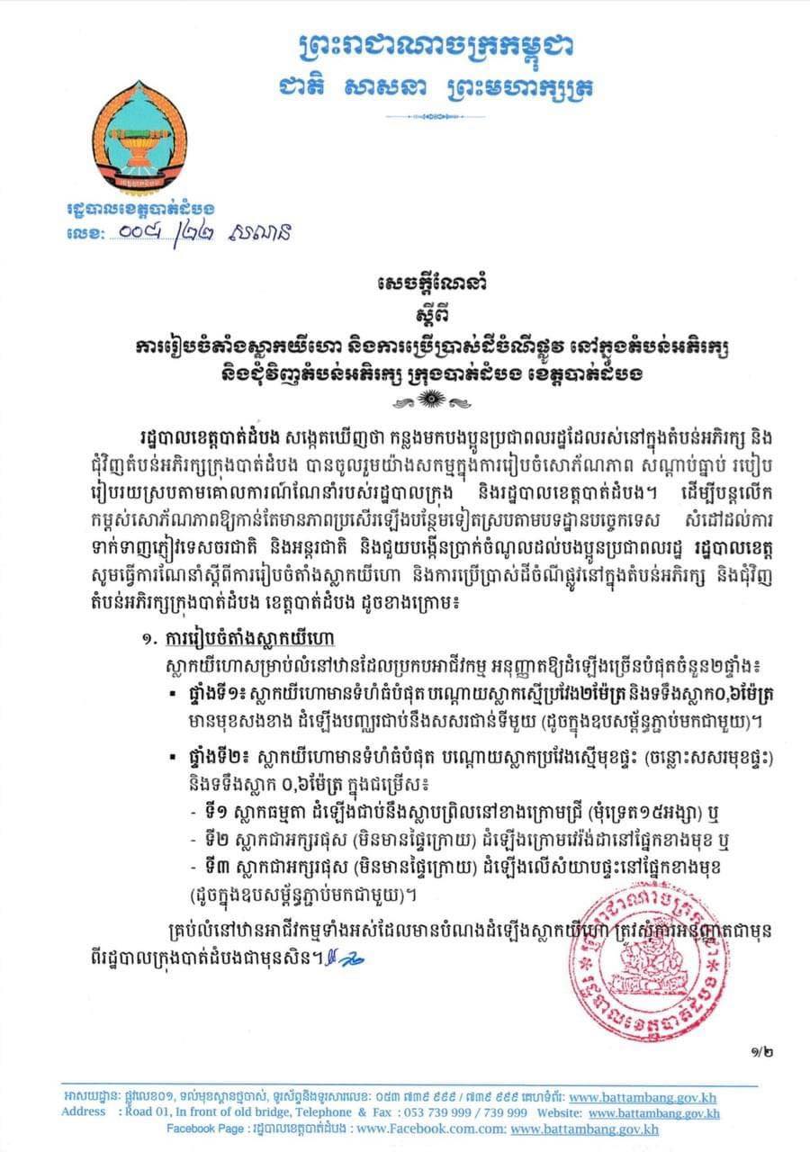 រដ្ឋបាលខេត្តបាត់ដំបង សង្កេតឃើញថា កន្លងមកបងប្អូនប្រជាពលរដ្ឋដែលរស់នៅក្នុងតំបន់អភិរក្ស និងជុំវិញតំបន់អភិរក្សក្រុងបាត់ដំបង បានចូលរួមយ៉ាងសកម្មក្នុងការរៀបចំសោភ័ណភាព សណ្ដាប់ធ្នាប់ របៀបរៀបរយ ស្របតាមគោលការណ៍ណែនាំរបស់រដ្ឋបាលក្រុង និងរដ្ឋបាលខេត្តបាត់ដំបង។ ដើម្បីបន្តលើកកម្ពស់សោភ័ណភាពឱ្យកាន់តែមានភាពប្រសើរឡើងបន្ថែមទៀតស្របតាមបទដ្ឋានបច្ចេកទេស សំដៅដល់ការទាក់ទាញភ្ញៀវទេសចរជាតិ និងអន្តរជាតិ និងជួយបង្កើនប្រាក់ចំណូលដល់បងប្អូនប្រជាពលរដ្ឋ រដ្ឋបាលខេត្តសូមធ្វើការណែនាំស្ដីពីការរៀបចំតាំងស្លាកយីហោ និងការប្រើប្រាស់ដីចំណីផ្លូវនៅក្នុងតំបន់ក្នុងតំបន់អភិរក្ស និងជំវិញតំបន់អភិរក្សក្រុងបាត់ដំបង ខេត្តបាត់ដំបង ដូចខាងក្រោម៖