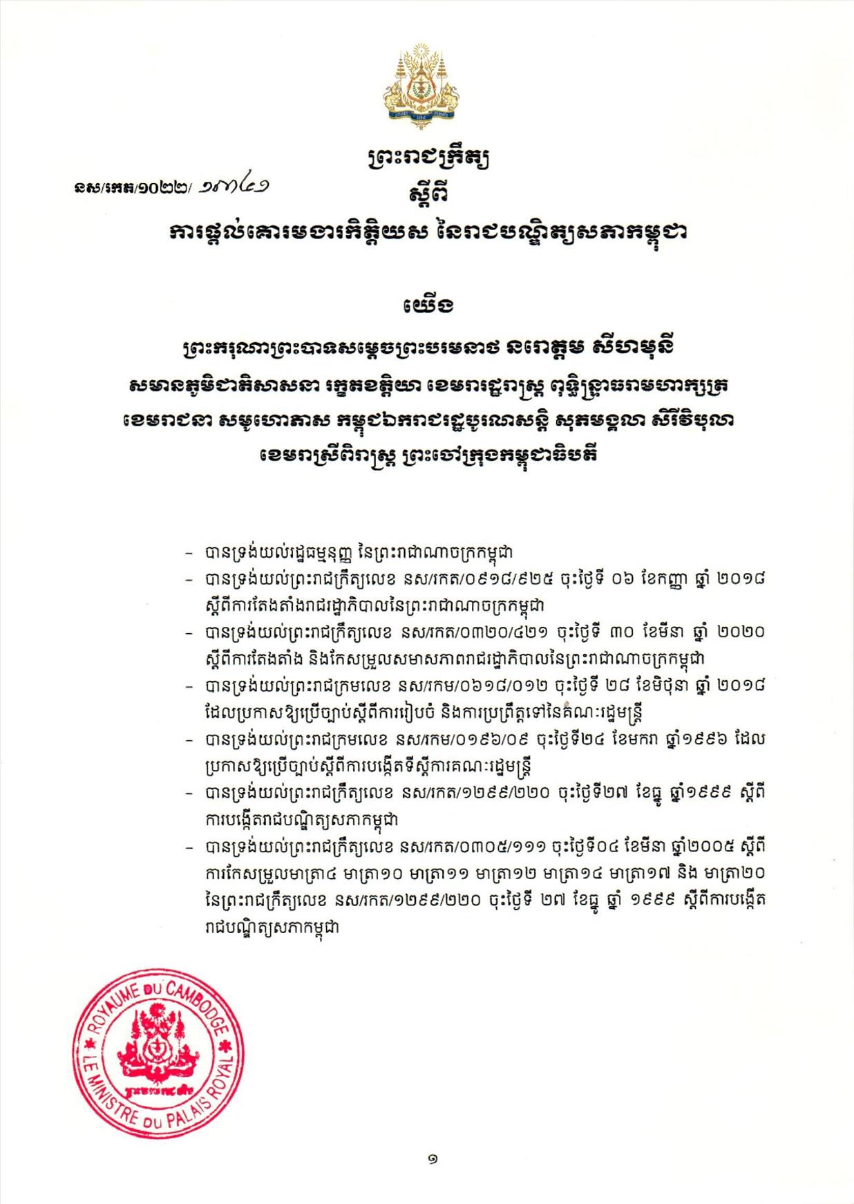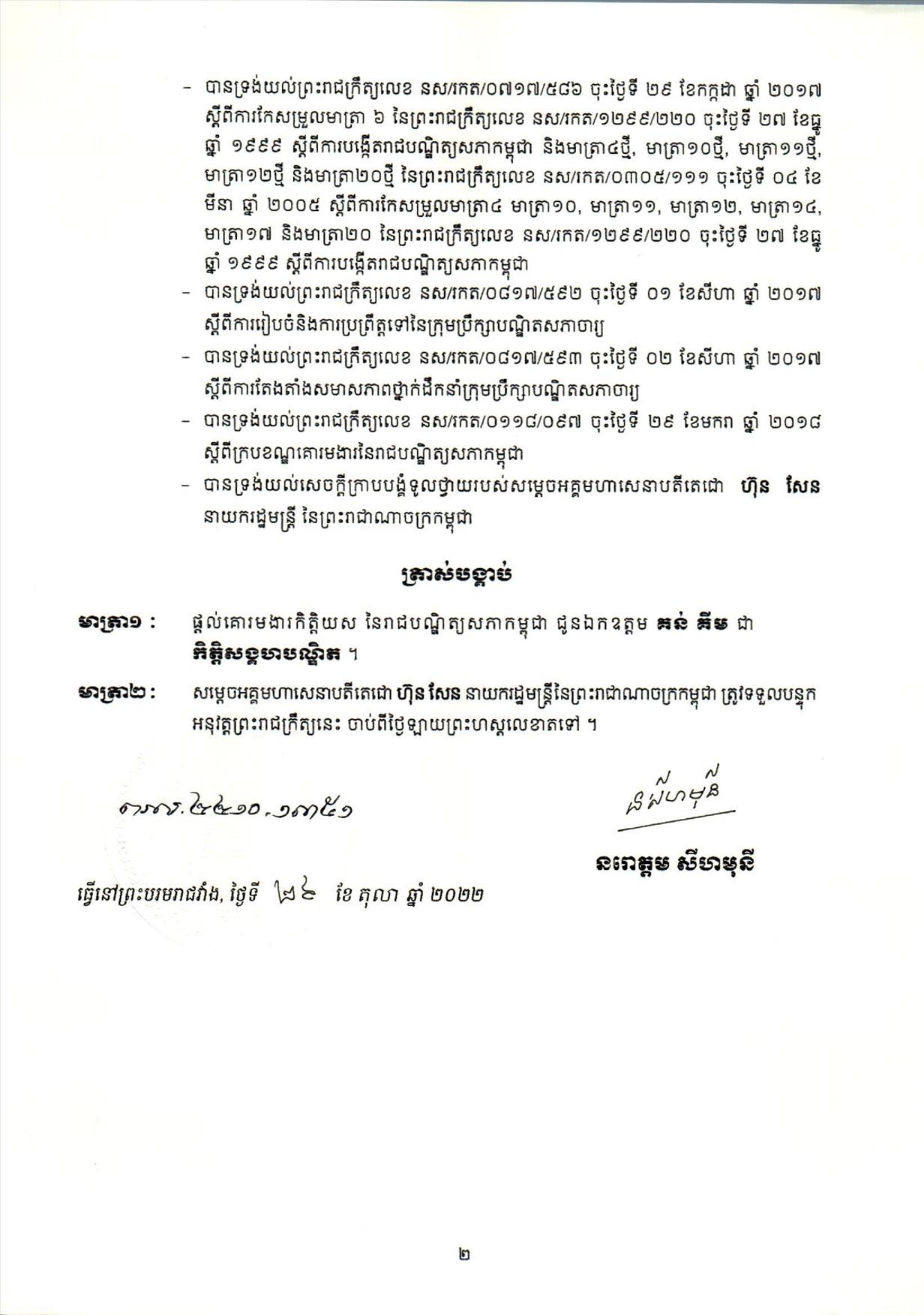 ព្រះមហាក្សត្រ ចេញព្រះរាជក្រឹត្យផ្តល់គោរមងារកិត្តិយស នៃរាជបណ្ឌិត្យសភាកម្ពុជា ជូនឯកឧត្ដម គន់ គីម ជា «កិត្តិសង្គហបណ្ឌិត»