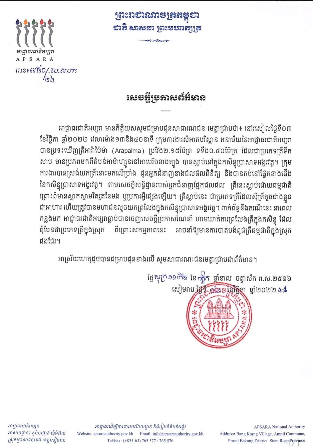 (សៀមរាប)៖ អាជ្ញាធរជាតិអប្សរា នៅថ្ងៃទី០៤ ខែវិច្ឆិកា បានចេញសេចក្តីប្រកាសព័ត៌មានទាក់ទងនឹង ក្រុមការងារសំអាតបរិស្ថាន អនាម័យនៃអាជ្ញាធរជាតិអប្សរា បានប្រទះឃើញត្រីអារ៉ាប៉ៃម៉ា (Arapaima) ប្រវែង ២.១៥ម៉ែត្រ ទទឹង ០.៤០ម៉ែត្រ ដែលប្រភេទត្រីទឹកសាប មានប្រភពមកពីតំបន់អាម៉ាហ្សូននៅអាមេរិកខាងត្បូង បានស្លាប់នៅក្នុងកសិន្ធុប្រាសាទអង្គរវត្ត។