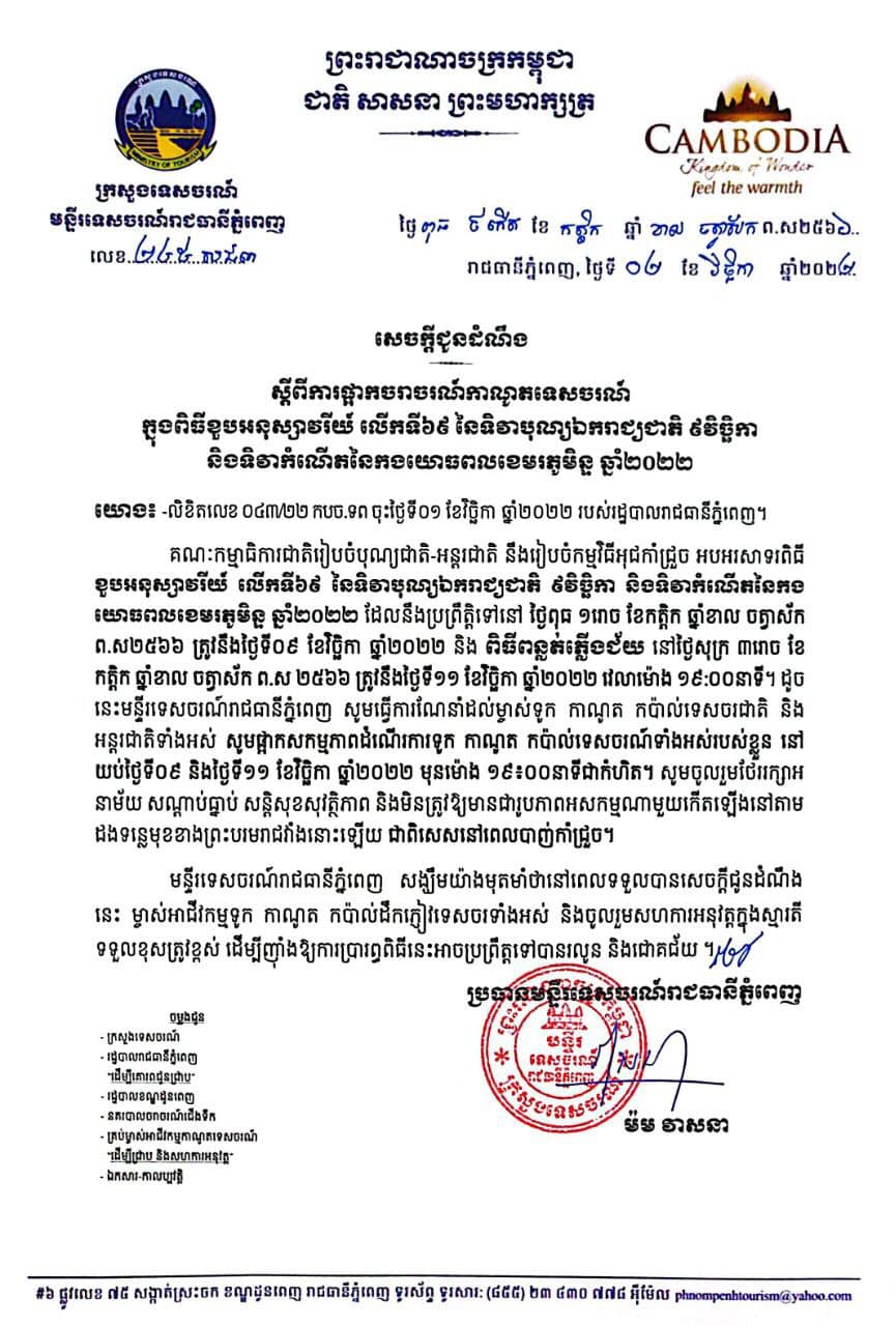 ដូចនេះមន្ទីរទេសចរណ៍រាជធានីភ្នំពេញ សូមធ្វើការណែនាំដល់ម្ចាស់ទូក កាណូត កប៉ាល់ទេសចរជាតិ និងអន្តរជាតិទាំងអស់ សូមផ្អាកសកម្មភាពដំណើរការទូក កាណូត កាប៉ាល់ទេសចរណ៍ទាំងអស់របស់ខ្លួន នៅយប់ថ្ងៃទី០៩ និងថ្ងៃទី១១ ខែវិច្ឆិកា ឆ្នាំ២០២២ មុនម៉ោង ១៩៖០០នាទីជាកំហិត។ សូមចូលរួមថែរក្សាអនាម័យ សណ្ដាប់ធ្នាប់ សន្តិសុខសុវត្ថិភាព និងមិនត្រូវឱ្យមានជារូបភាពអសកម្មណាមួយកើតឡើងនៅតាមដងទន្លេមុខខាងព្រះបរមរាជវាំងនោះឡើយ ជាពិសេសនៅពេលបាញ់កាំជ្រួច ៕