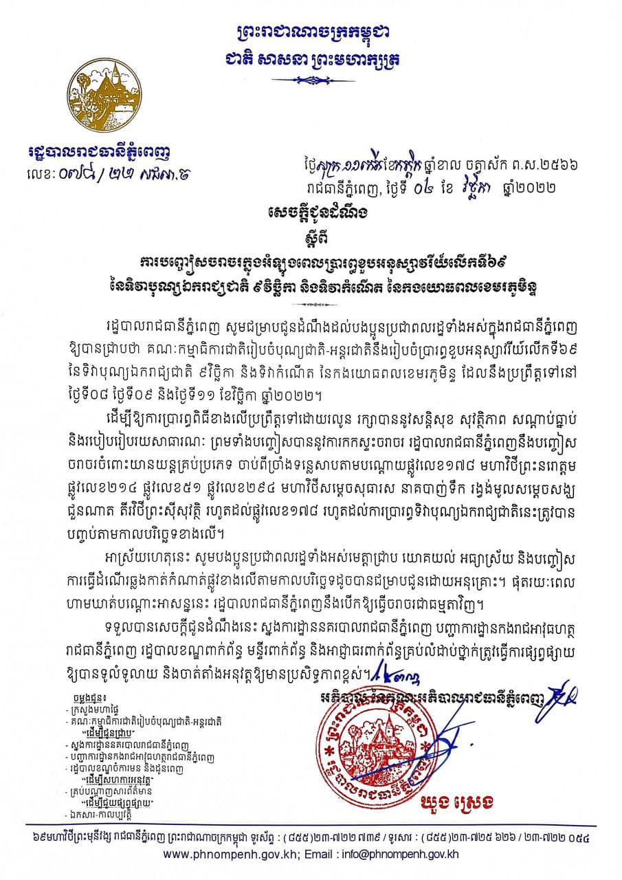 រដ្ឋបាលរាជធានីភ្នំពេញ ជូនដំណឹងពីការបញ្ចៀសចរាចរ ក្នុងអំឡុងពេលប្រារព្ធខួបអនុស្សាវរីយ៍លើកទី៦៩ ទិវាបុណ្យឯករាជ្យជាតិ