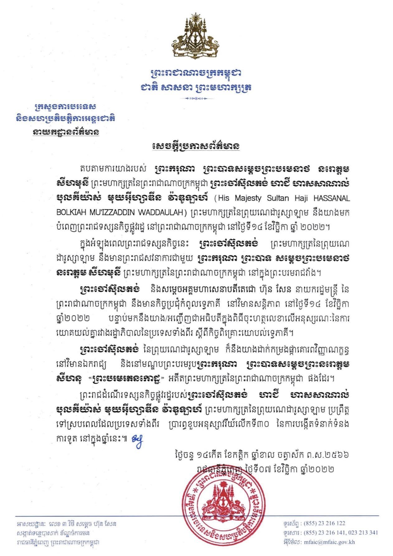 (ភ្នំពេញ)៖ តបតាមការយាងរបស់ ព្រះករុណា ព្រះបាទសម្តេចព្រះបរមនាថ នរោត្តម សីហមុនី ព្រះមហាក្សត្រនៃព្រះរាជាណាចក្រកម្ពុជា ព្រះចៅស៊ុលតង់ ហាជី ហាសសាណាល់ បុលគីយ៉ាស់ មុយអ៉ីហ្សាឌីន វ៉ាឌូឡាហ៍ ព្រះមហាក្សត្រនៃព្រុយណេដារូស្សាឡាម នឹងយាងមកបំពេញព្រះរាជទស្សនកិច្ចផ្លូវរដ្ឋ នៅព្រះរាជាណាចក្រកម្ពុជា នៅថ្ងៃទី១៤ ខែវិច្ឆិកា ឆ្នាំ ២០២២។