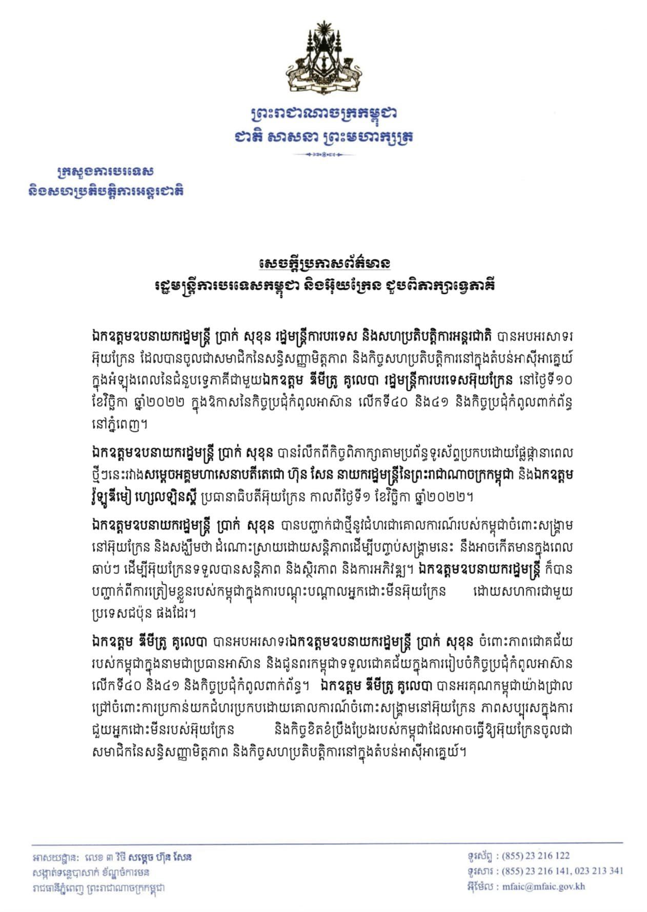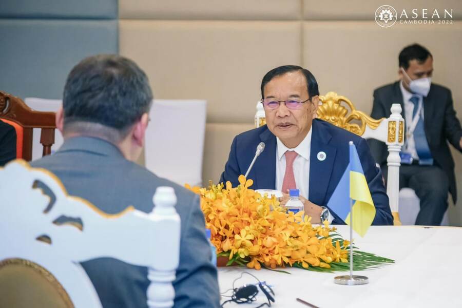 យោងតាមសេចក្តីប្រកាសព័ត៌មានរបស់ក្រសួងការបទេស និងសហប្រតិបត្តិការ អន្តរជាតិបានឱ្យដឹងថា ឯកឧត្តមឧបនាយករដ្ឋមន្ត្រី ប្រាក់ សុខុន រដ្ឋមន្ត្រីការបរទេស និងសហប្រតិបត្តិការអន្តរជាតិ បានអបអរសាទរអ៊ុយក្រែន ដែលបានចូលជាសមាជិក នៃសន្ធិសញ្ញាមិត្តភាព និងកិច្ចសហប្រតិបត្តិការនៅក្នុងតំបន់អាស៊ីអាគ្នេយ៍ក្នុងអំឡុងពេល នៃជំនួបទ្វេភាគីជាមួយឯកឧត្តម ឌីមីត្រូ គូលេបា រដ្ឋមន្ត្រីការបរទេសអ៊ុយក្រែន នៅថ្ងៃទី១០ ខែវិច្ឆិកា ឆ្នាំ២០២២ ក្នុងឱកាសនៃកិច្ចប្រជុំកំពូលអាស៊ានលើកទី៤០ និង៤១ និងកិច្ចប្រជុំ កំពូលពាក់ព័ន្ធ នៅភ្នំពេញ។