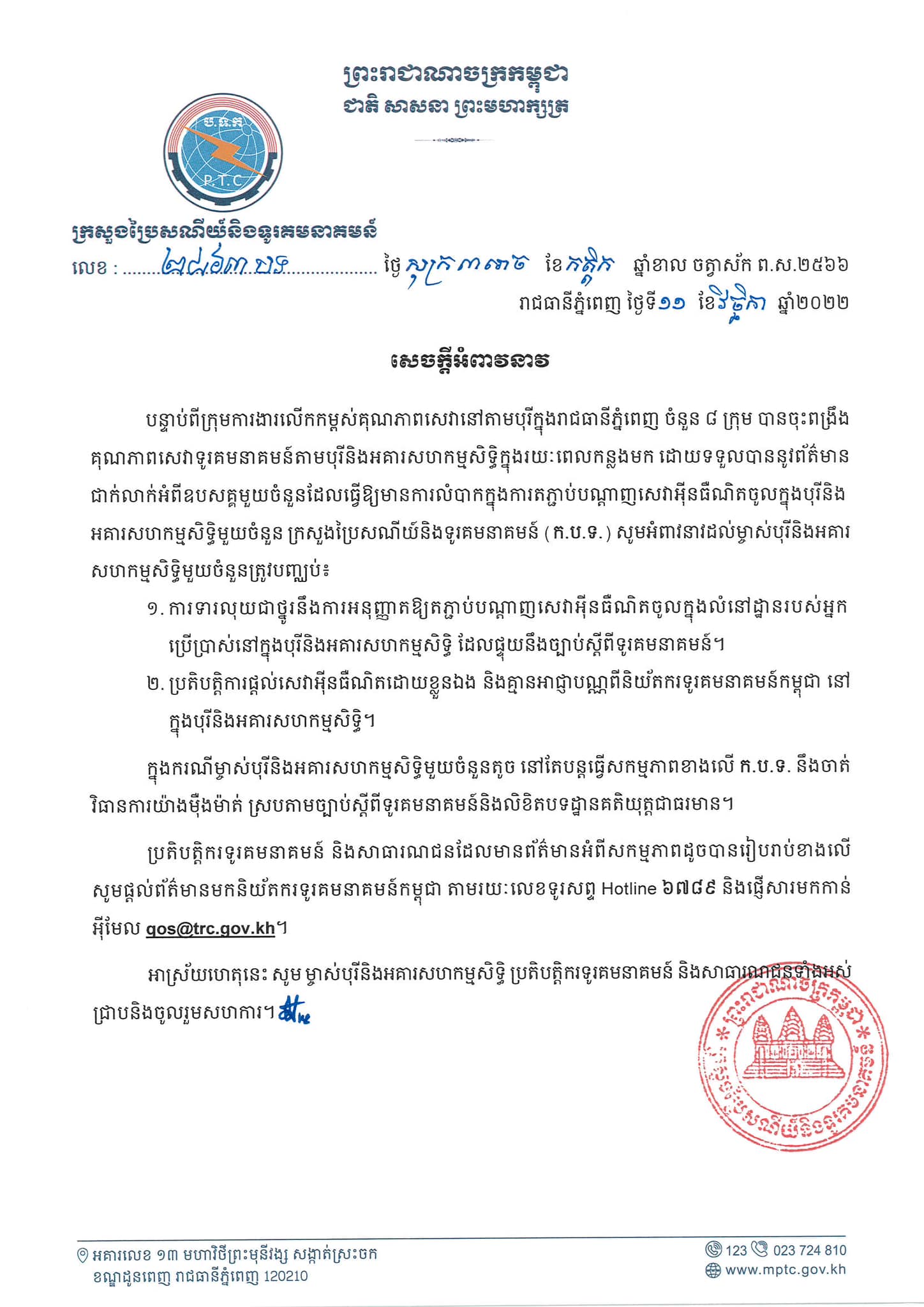 អាស្រ័យហេតុនេះ សូម ម្ចាស់បុរីនិងអគារសហកម្មសិទ្ធិ ប្រតិបត្តិករទូរគមនាគមន៍ និងសាធារណជនទាំងអស់ ជ្រាបនិងចូលរួមសហការ៕