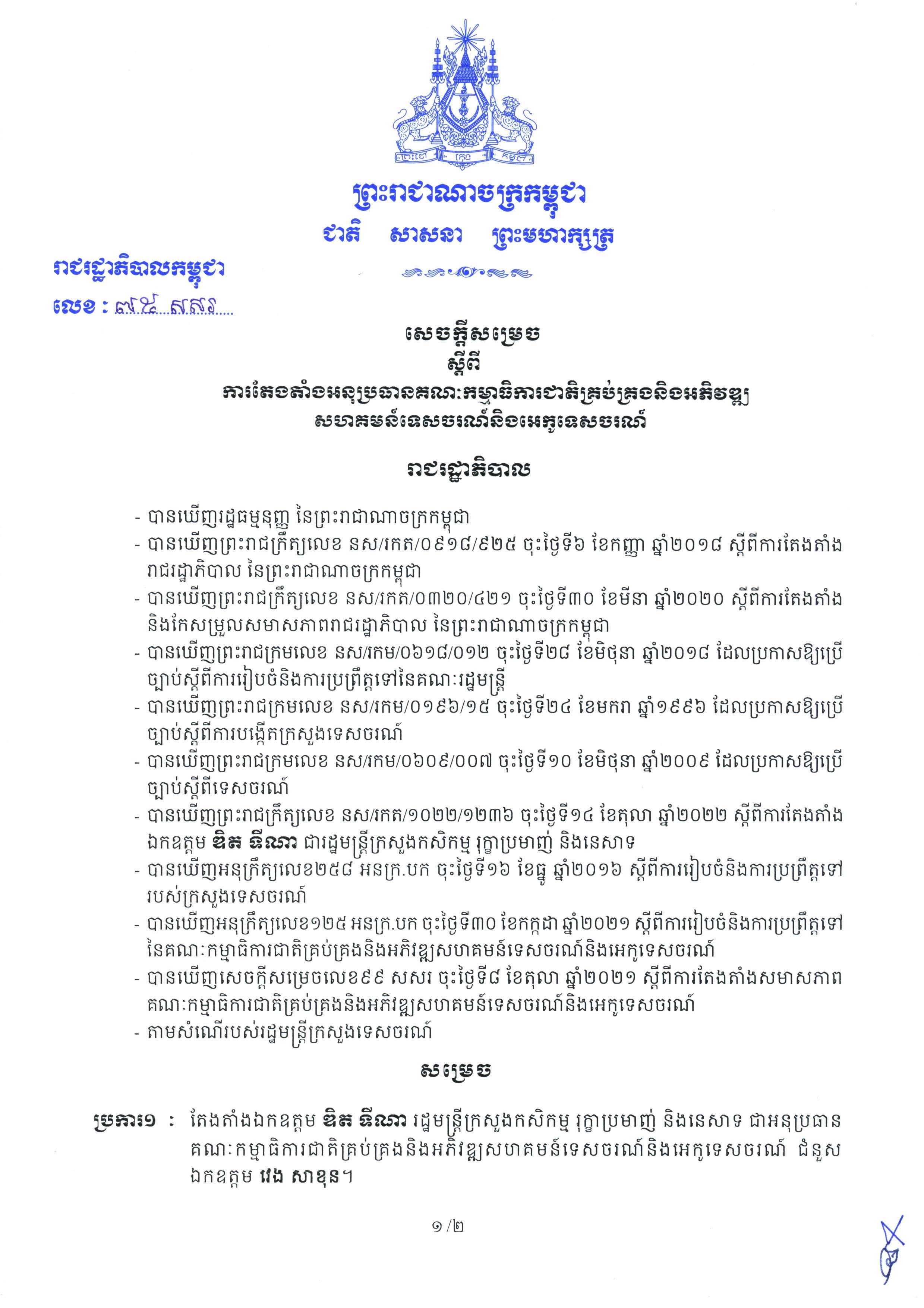 រាជធានីភ្នំពេញ៖ យោងតាមសារលិខិតរបស់ រាជរដ្ឋាភិបាលកម្ពុជា នៅថ្ងៃទី១៥ ខែវិច្ឆិកា ឆ្នាំ២០២២ បានសេចក្ដីសម្រេចស្ដីពី ការតែងតាំងអនុប្រធានគណៈកម្មាធិការជាតិគ្រប់គ្រងនិងអភិវឌ្ឍសហគមន៍ទេសចរណ៍និងអេកូទេសចរណ៍។