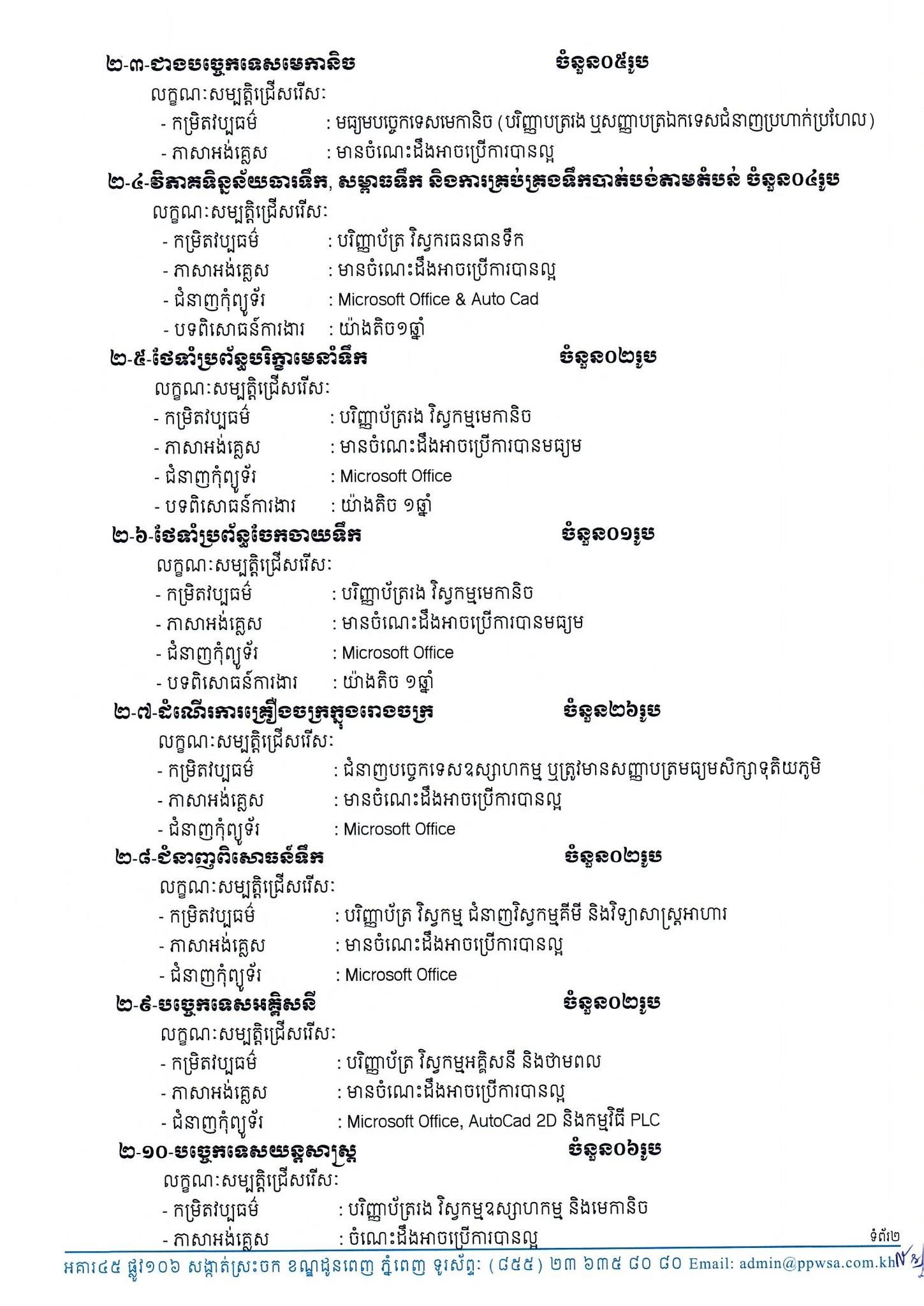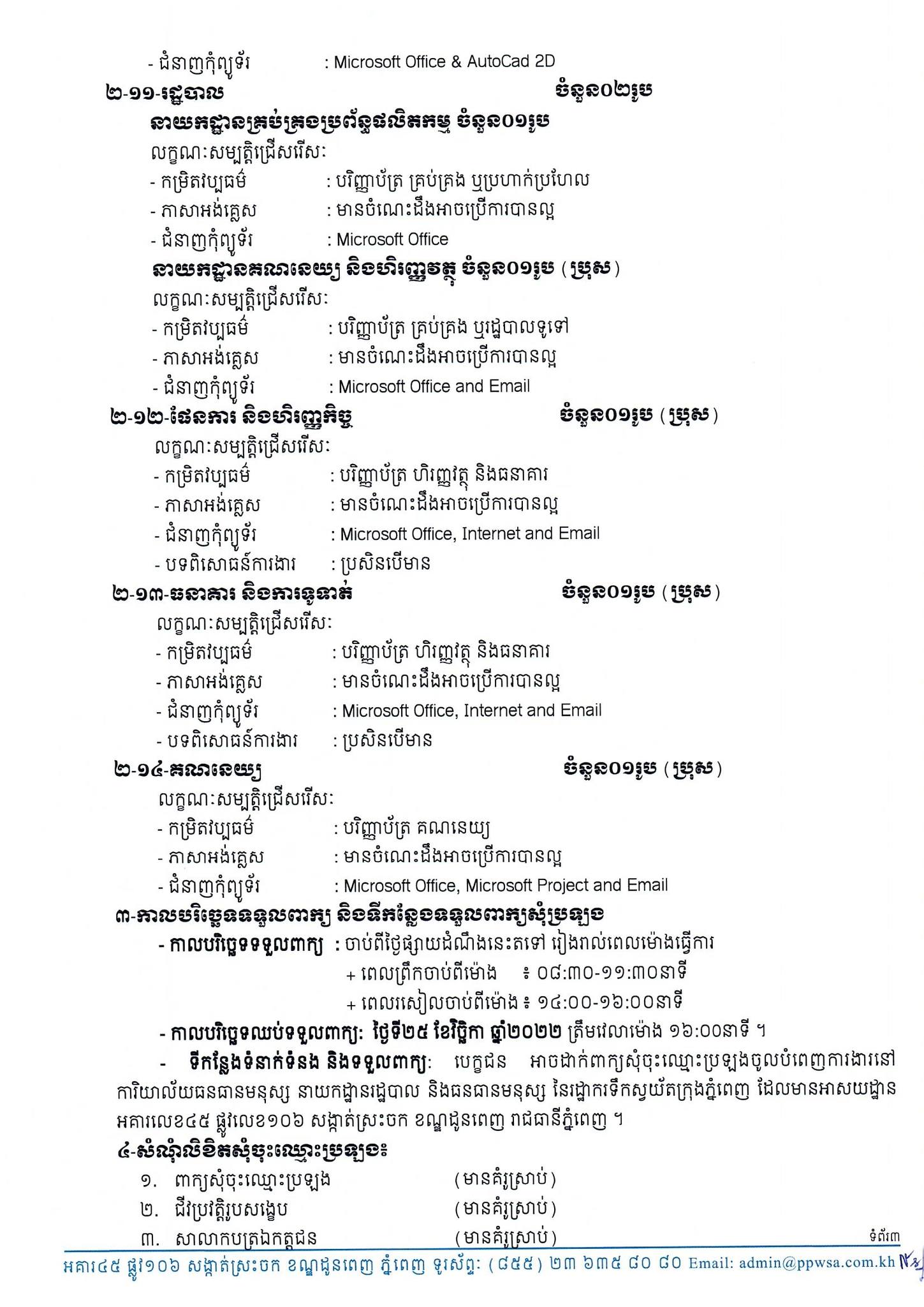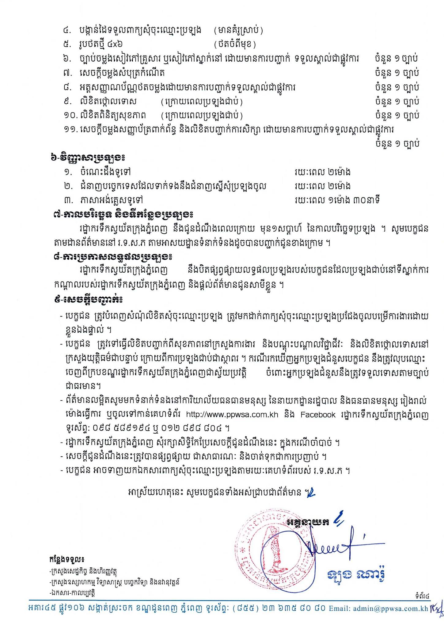 – ទីកន្លែងទំនាក់ទំនង និងទទួលពាក្យ៖ ការិយាល័យធនធានមនុស្ស នៃនាយកដ្ឋានរដ្ឋបាល និងធនធានមនុស្ស នៃរដ្ឋាករទឹកស្វយ័តក្រុងភ្នំពេញ។