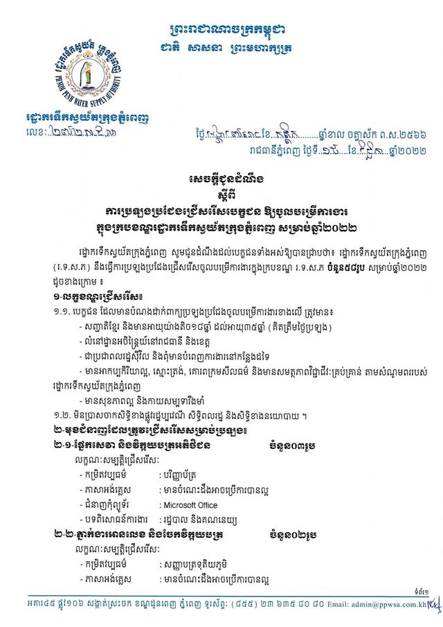 រាជធានីភ្នំពេញ៖ យោងតាមការចុះផ្សាយរបស់ រដ្ឋាករទឹកស្វយ័តក្រុងភ្នំពេញ នៅថ្ងៃទី១៥ ខែវិច្ឆិកា ឆ្នាំ២០២២ បានចេញសេចក្តីជូនដំណឹង ស្តីពីការប្រឡងជ្រើសរើស បេក្ខជន និងបេក្ខនារី ចូលបម្រើការងារក្នុងក្របខណ្ឌរដ្ឋាករទឹកស្វយ័តក្រុងភ្នំពេញ សម្រាប់ឆ្នាំ២០២២។