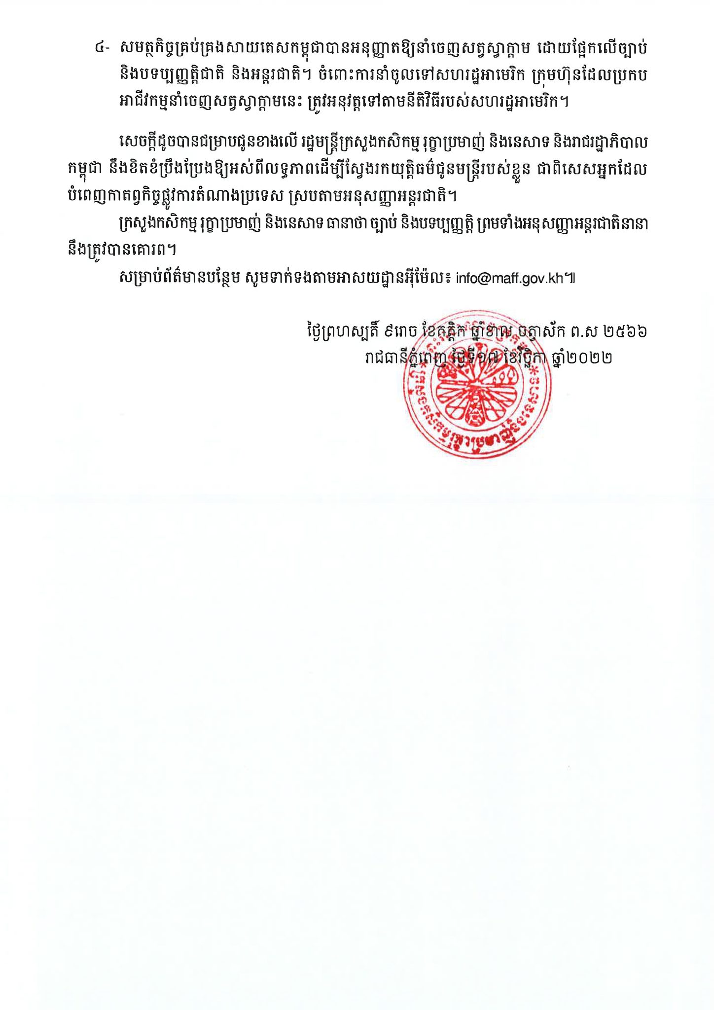 សូមអានសេចក្ដីប្រកាសព័ត៌មានរបស់ ក្រសួងកសិកម្ម រុក្ខាប្រមាញ់ និងនេសាទ ដូចខាងក្រោម៖