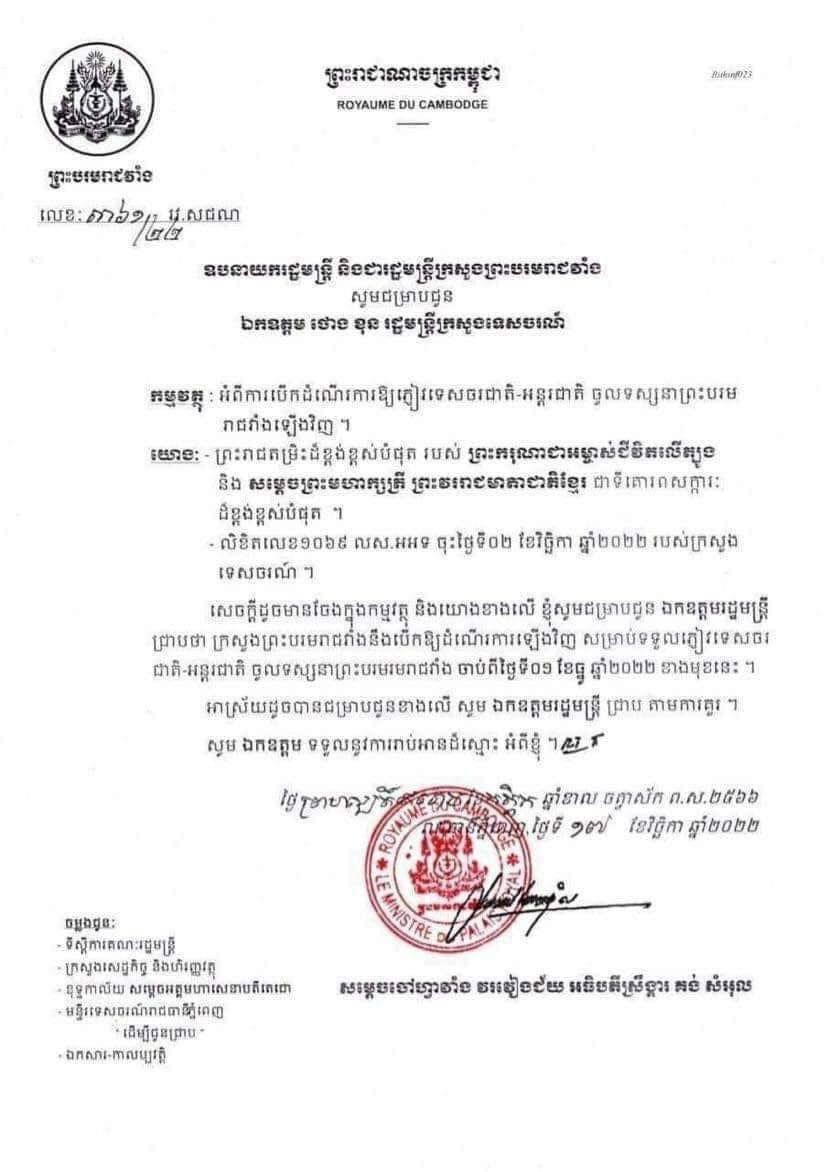 ក្រសួងព្រះបរមរាជវាំង អនុញ្ញាតឱ្យភ្ញៀវជាតិ-អន្តរជាតិ ចូលទស្សនាព្រះបរមរាជវាំងឡើងវិញ ចាប់ពីថ្ងៃទី០១ ខែធ្នូ ឆ្នាំ២០២២