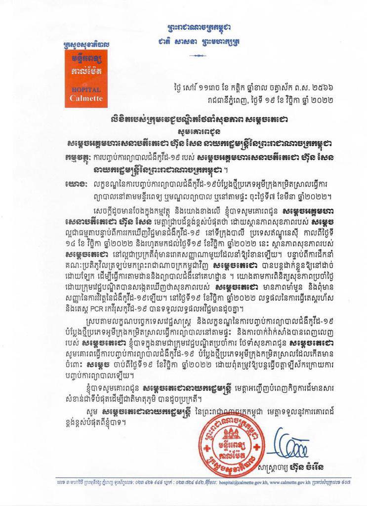 (ភ្នំពេញ)៖ សម្តេចតេជោ ហ៊ុន សែន នាយករដ្ឋមន្ត្រីនៃកម្ពុជា នៅល្ងាចថ្ងៃទី១៩ ខែវិច្ឆិកា ឆ្នាំ២០២២ បានបង្ហាញថាសម្តេច បានជាសះស្បើយទាំងស្រុងពីជំងឺកូវីដ-១៩។