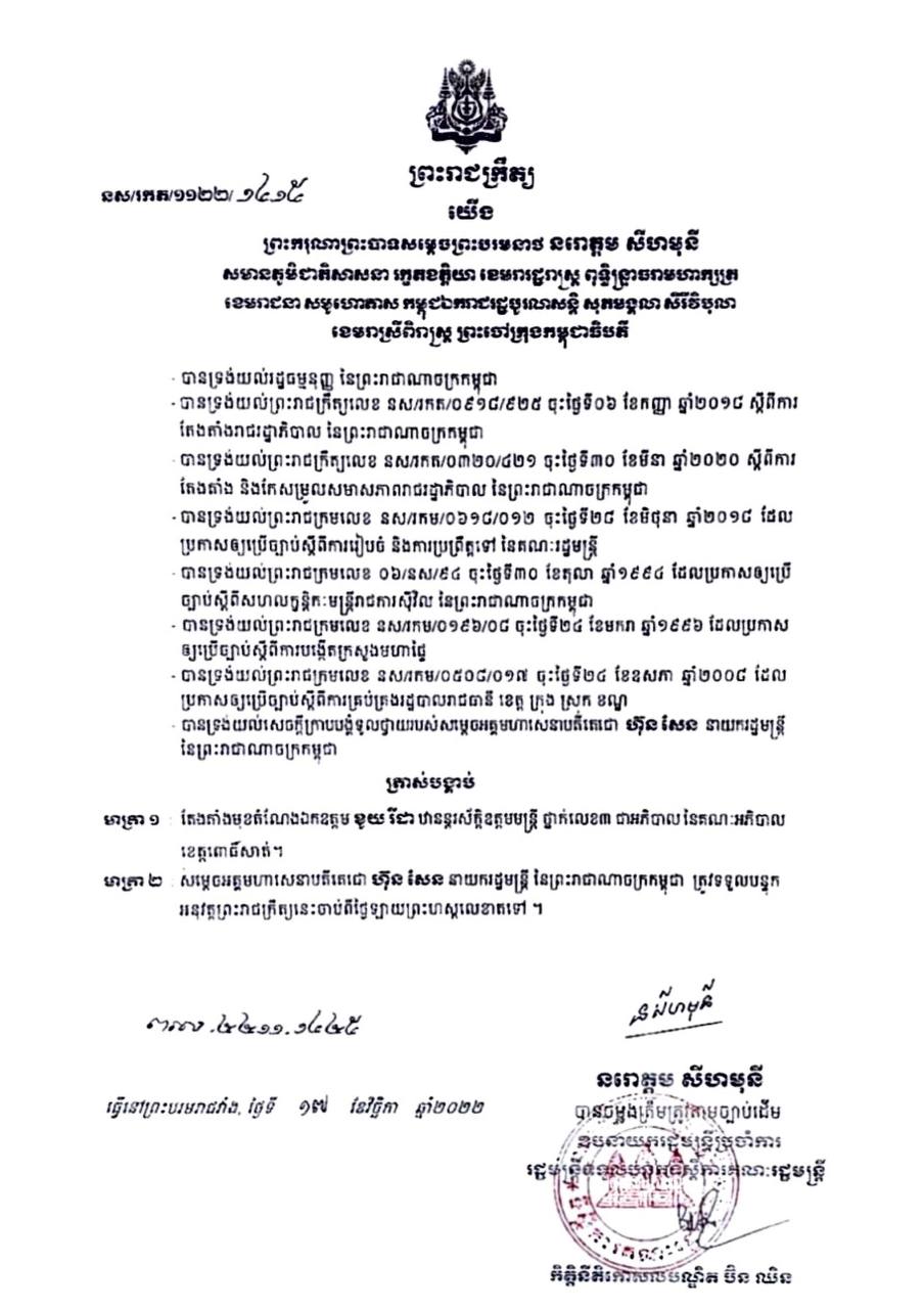 ព្រះមហាក្សត្រ ត្រាស់បង្គាប់ តែងតាំងមុខតំណែងឯកឧត្តម ខូយ រីដា ឋានន្តរស័ក្ដិឧត្តមមន្ត្រី ថ្នាក់លេខ៣ ជាអភិបាល នៃគណៈអភិបាលខេត្តពោធិ៍សាត់ ៕