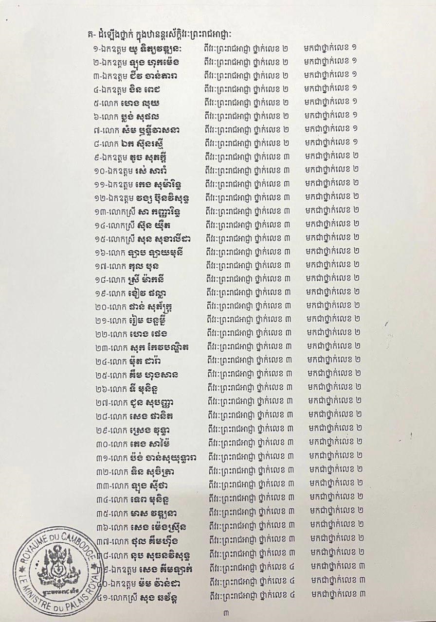 ព្រះរាជអាជ្ញា ៤០រូប ត្រូវបានដំឡើងថ្នាក់ក្នុងឋានន្តរស័ក្តិឧត្តមព្រះរាជអាជ្ញា, ព្រះរាជអាជ្ញា ១០រូប ត្រូវបានដំឡើងថ្នាក់ពីឋានន្តរស័ក្តិវរៈព្រះរាជអាជ្ញា មកជាឋានន្តរស័ក្តិឧត្តមព្រះរាជអាជ្ញា, ព្រះរាជអាជ្ញា ៥៤រូប ត្រូវបានដំឡើងថ្នាក់ ក្នុងឋានន្តរស័ក្តិវរៈព្រះរាជអាជ្ញា និងព្រះរាជអាជ្ញា ៧រូប ត្រូវបានដំឡើងឋានន្តរស័ក្តិ និងថ្នាក់ ពីឋានន្តរស័ក្តិអនុព្រះរាជអាជ្ញា មកជាឋានន្តរស័ក្តិវរៈព្រះរាជអាជ្ញា៕