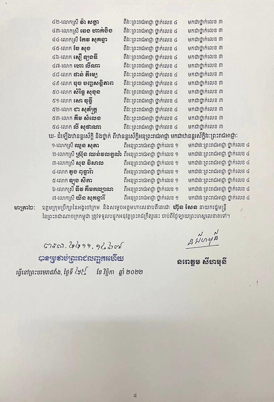 រាជធានីភ្នំពេញ៖ យោងតាមព្រះរាជក្រឹត្យរបស់ ព្រះករុណា ព្រះបាទសម្តេចព្រះបរមនាថ នរោត្តម សីហមុនី ព្រះមហាក្សត្រនៃកម្ពុជា នៅថ្ងៃទី២៦ ខែវិច្ឆិកា ឆ្នាំ២០២២ ទ្រង់បានត្រាស់បង្គាប់ ដំឡើងឋានន្តរស័ក្ដិ និងថ្នាក់ នៃក្របខណ្ឌព្រះរាជអាជ្ញា ប្រចាំឆ្នាំ២០២២ ដល់ព្រះរាជអាជ្ញា ១១១រូប ដែលបានដំឡើងឋានន្តរស័ក្តិ និងថ្នាក់នេះមាន៤កម្រិតរួមមាន៖