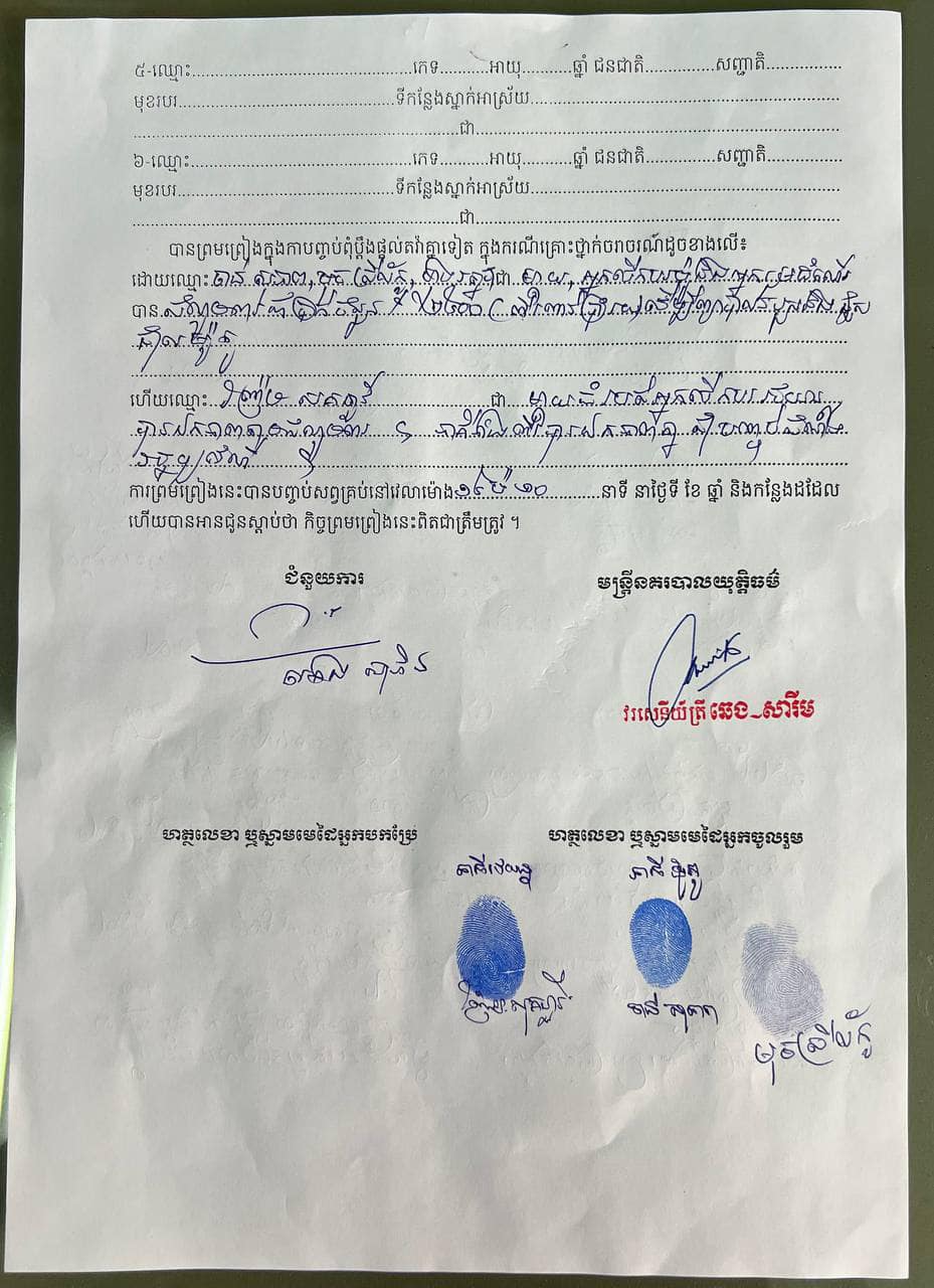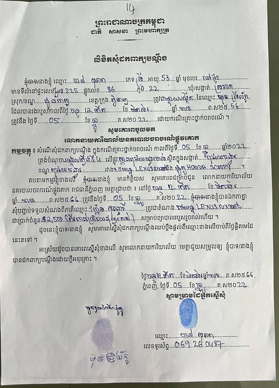 សូមបញ្ជាក់ថា ក្នុងករណីគ្រោះថ្នាក់នេះ ភាគីទាំងអស់បានឯកភាពគ្នាសុំបញ្ចប់សំណងរដ្ឋប្បវេណីចំនួន ២,៥០០ដុល្លារ ដោយមិនមានការបង្ខិតបង្ខំ នៅការិយាល័យនគរបាលចរាចរណ៍ផ្លូវគោក កាលពីថ្ងៃទី៥ ខែធ្នូ ឆ្នាំ២០២២ រួចរាល់ហើយ (សូមជូនភ្ជាប់នូវកិច្ចព្រមព្រៀងបញ្ចប់សំណង និងលិខិតដកពាក្យបណ្តឹងរបស់ម្តាយជនរងគ្រោះ) ។