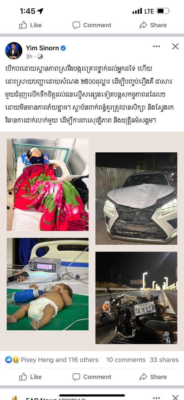 •ភាគីរថយន្តម៉ាក ជាជនបង្ក ៖ LEXUS NX200t ពណ៌ស ពាក់ផ្លាកលេខ ភ្នំពេញ 2BB-9989 បើកបរដោយឈ្មោះ សោម ណូរីទីឃា ភេទប្រុស អាយុ១៩ឆ្នាំ មានទីលំនៅផ្ទះលេខ៥៣ ផ្លូវកែវចិន្តា ភូមិ៣ សង្កាត់ជ្រោយចង្វារ ខណ្ឌជ្រោយចង្វារ រាជធានីភ្នំពេញ (ឃាត់ខ្លួនកាលពីថ្ងៃ០៥ ខែធ្នូ ឆ្នាំ២០២២)។