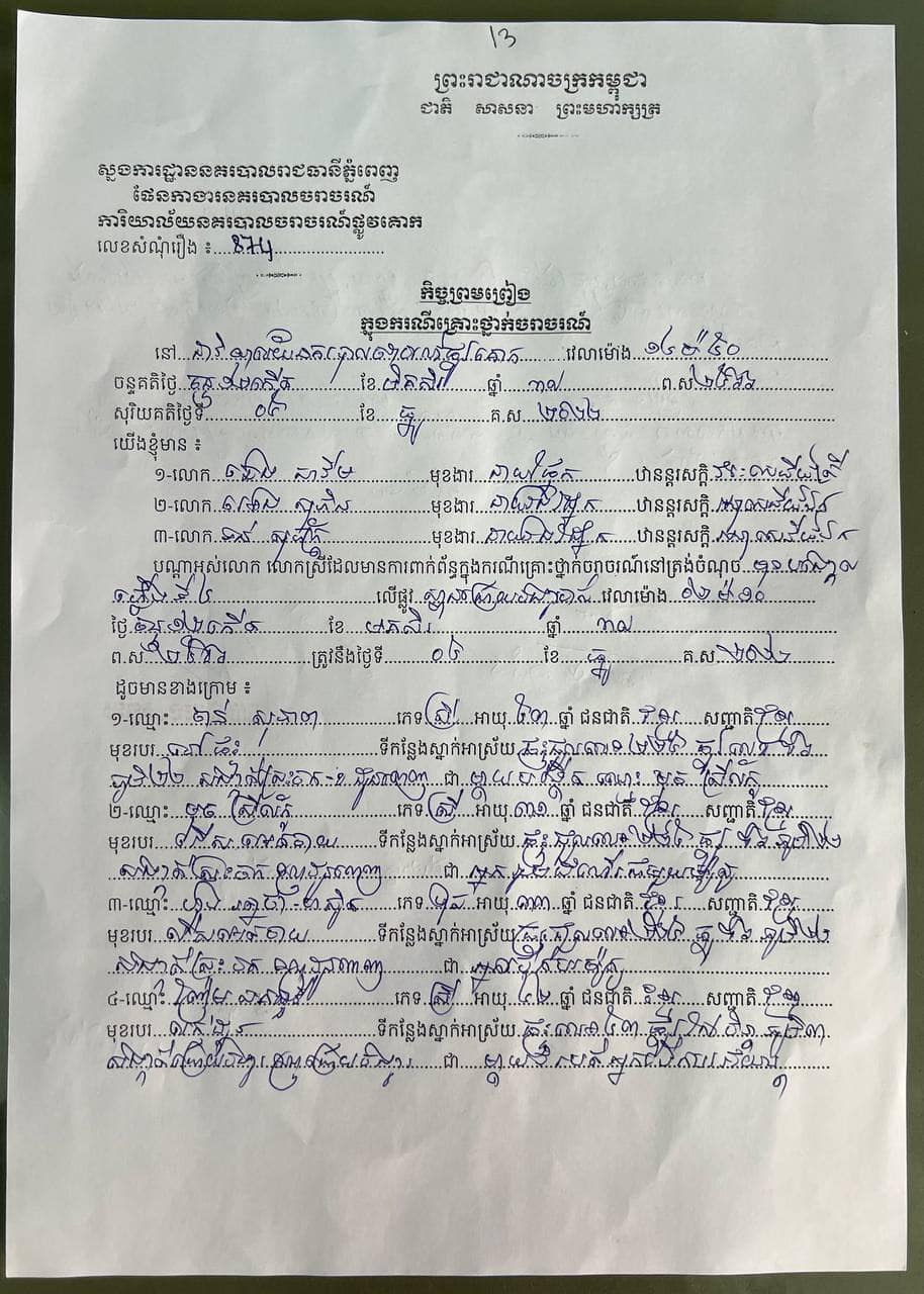 • ភាគីម៉ូតូម៉ាក ជាជនរងគ្រោះ ៖ HONDA SCOOPY ពណ៌ស ពាក់ផ្លាកលេខ កណ្តាល 1B-9978 បើកបរដោយឈ្មោះ ហុង រត្នថា ហៅស្វិត ភេទប្រុស អាយុ៣៣ឆ្នាំ មុខរបររើសអេតចាយ (រងរបួស ធ្ងន់សម្រាកព្យាបាលនៅមន្ទីរពេទ្យមិត្តភាពកម្ពុជា-ចិនព្រះកុសុមៈ) រួមដំណើរជាមួយ មានគ្នា០២នាក់ទី១-ឈ្មោះ មុច សុខឡេង ភេទប្រុស អាយុ៦០ថ្ងៃ (រងរបួសធ្ងន់កំពុងសម្រាកព្យាបាលនៅមន្ទីរពេទ្យគន្ធបុប្ផា) និងទី២-ឈ្មោះ មុច ស្រីល័ក្ខ ភេទស្រី អាយុ៣១ឆ្នាំ មុខរបរ រើសអេតចាយ (រងរបួសធ្ងន់សម្រាកព្យាបាលនៅគ្លីនិកពន្លឺ) អ្នកទាំងបីស្នាក់នៅផ្ទះជួលលេខ២២៥ ផ្លូវលេខ៨៦ ភូមិ២២ សង្កាត់ស្រះចក ខណ្ឌដូនពេញ រាជធានីភ្នំពេញ។