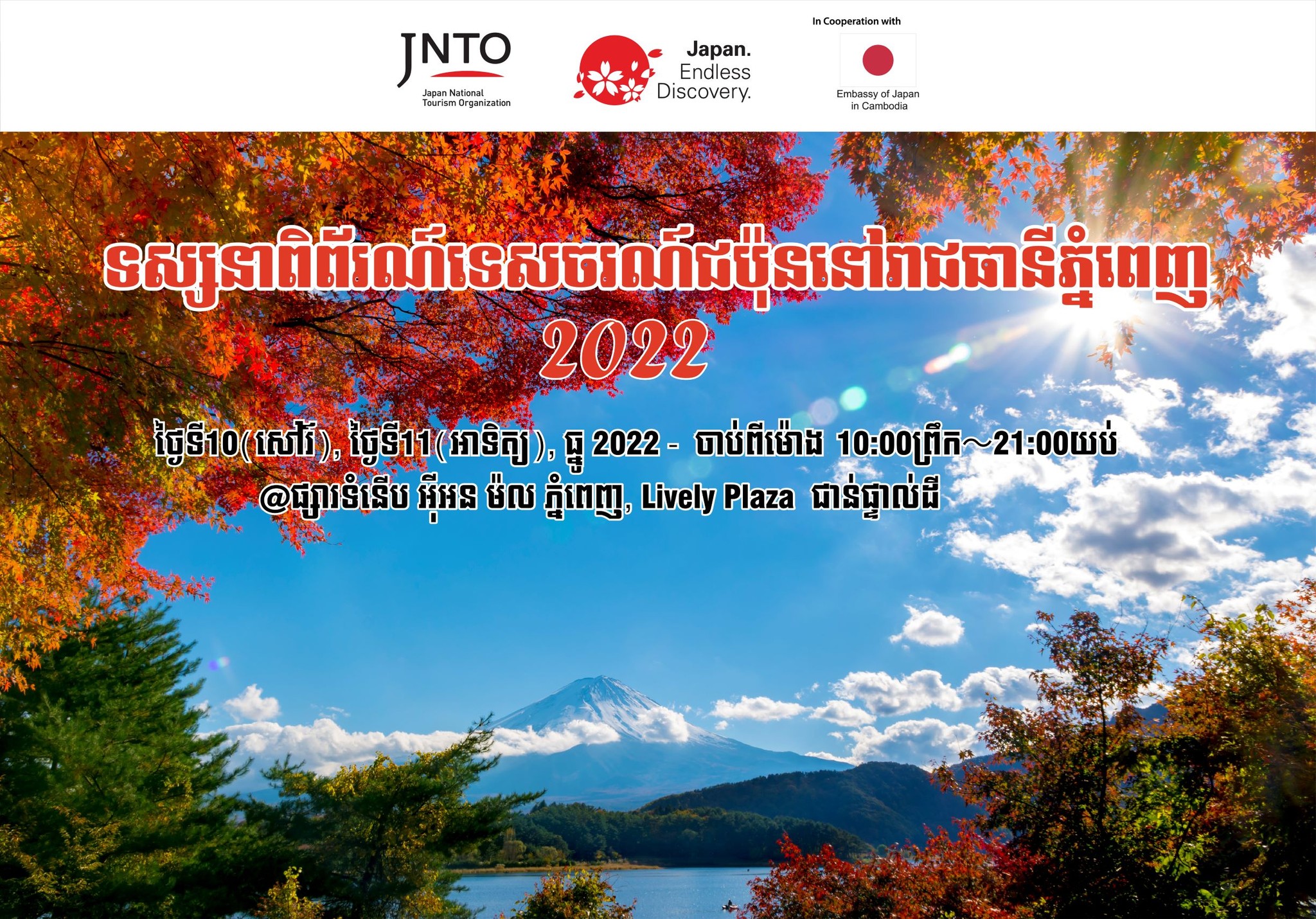 (ភ្នំពេញ)៖ ស្ថានទូតជប៉ុននឹងសហការរៀបចំកម្មវិធី «ពិព័រណ៍ទេសចរណ៍ជប៉ុនឆ្នាំ២០២២» ដែលធ្វើឡើងនៅផ្សារទំនើបអ៊ីអនម៉លភ្នំពេញ ជាន់ផ្ទាល់ដី Lively Plaza ពីថ្ងៃសៅរ៍ ទី១០- ថ្ងៃអាទិត្យ ទី ១១ខែធ្នូ ឆ្នាំ២០២២ ពីម៉ោង១០:០០ព្រឹក ដល់ ៩យប់។