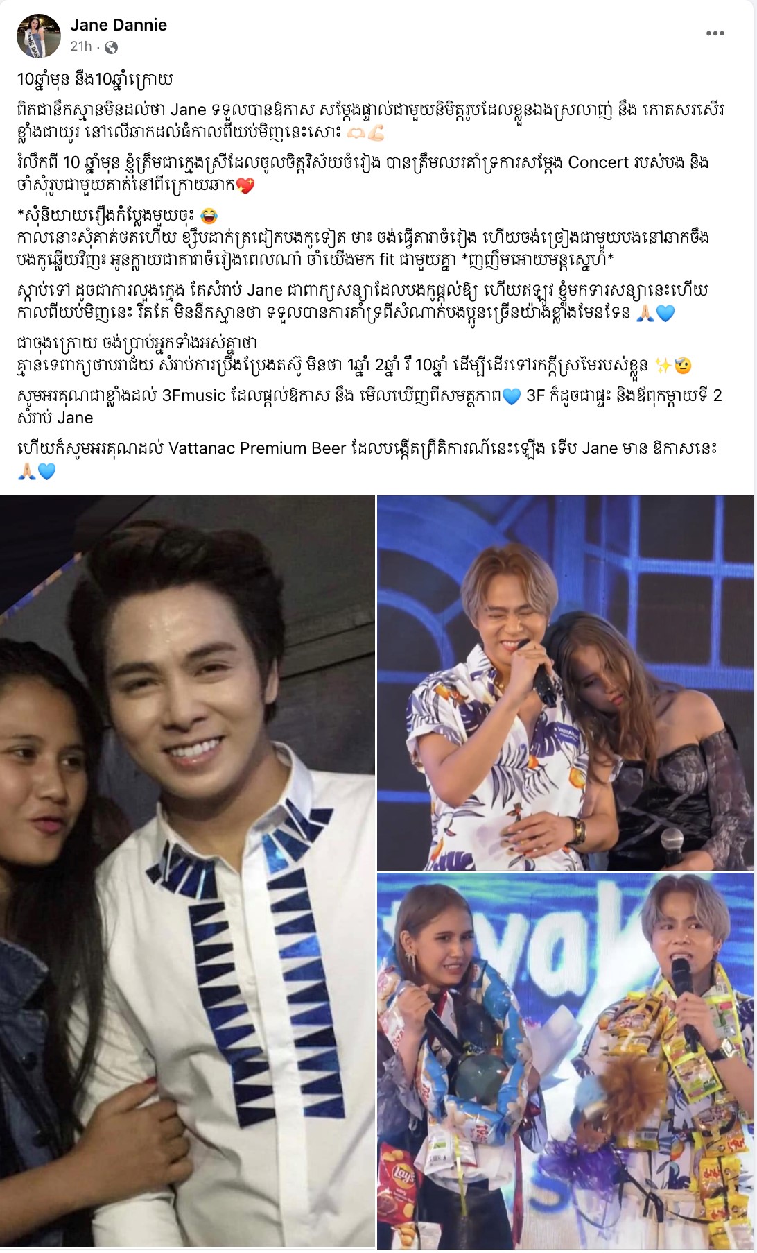 ដោយ កញ្ញា ជេនបានលើកឡើងថា «១០ឆ្នាំមុន នឹង១០ឆ្នាំក្រោយ ពិតជានឹកស្មានមិនដល់ថា Jane ទទួលបាន ឱកាស សម្ដែងផ្ទាល់ជាមួយនិមិត្តរូបដែលខ្លួនឯងស្រលាញ់ និង កោតសរសើរខ្លាំងជាយូរ នៅលើឆាកដ៏ធំ កាលពីយប់មិញនេះសោះ រំលឹកពី១០ឆ្នាំមុន ខ្ញុំត្រឹមជាក្មេងស្រីដែលចូលចិត្តវិស័យចម្រៀង បានត្រឹមឈរ គាំទ្រការសម្ដែង Concert របស់បង និងចាំសុំថតរូបជាមួយគាត់នៅពីក្រោយឆាក *សុំនិយាយរឿងកំប្លែងមួយចុះកាលនោះសុំគាត់ថតហើយ ខ្សឹបដាក់ត្រជៀកបងកូទៀតថា៖ចង់ធ្វើតារាចំរៀង ហើយចង់ច្រៀង ជាមួយបង នៅឆាកចឹង បងកូឆ្លើយវិញ៖ អូនក្លាយជាតារាចំរៀងពេលណា៎ ចាំយើងមក fit ជាមួយគ្នា *ញញឹមអោយមន្តសេ្នហ៏* ស្តាប់ទៅ ដូចជាការលួងក្មេង តែសំរាប់ Jane ជាពាក្យសន្យាដែលបងកូផ្ដល់ឱ្យ ហើយឥឡូវ ខ្ញុំមកទារសន្យា នេះហើយ កាលពីយប់មិញនេះ រឹតតែ មិននឹកស្មានថាទទួលបានការគាំទ្រ ពីសំណាក់ បងប្អូនច្រើនយ៉ាងខ្លាំង មែនទែន ជាចុងក្រោយ ចង់ប្រាប់អ្នកទាំងអស់គ្នាថាគ្មានទេពាក្យថាបរាជ័យ សំរាប់ការប្រឹងប្រែងតស៊ូ មិនថា ១ឆ្នាំ ២ឆ្នាំ ឬ ១០ឆ្នាំ ដើម្បីដើរទៅរកក្ដីស្រមៃរបស់ខ្លួន សូមអរគុណជាខ្លាំងដល់ 3Fmusic ដែលផ្ដល់ឱកាស នឹង មើលឃើញពីសមត្ថភាព 3F ក៏ដូចជាផ្ទះ និងឪពុកម្ដាយទី២ សំរាប់ Jane ហើយក៏សូមអរគុណដល់ Vattanac Premium Beer ដែលបង្កើតព្រឹតិការណ៍នេះឡើង ទើប Jane មាន ឱកាសនេះ»៕