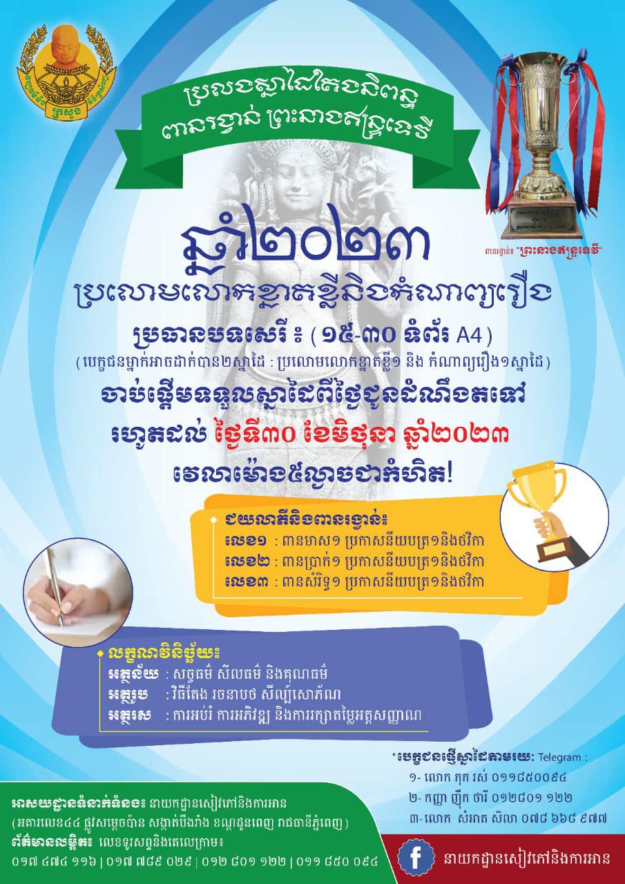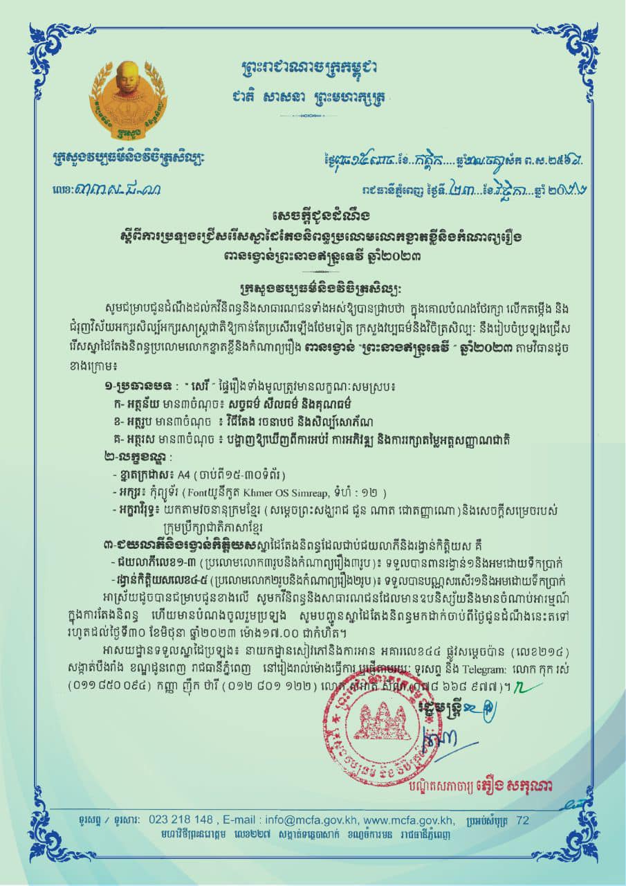 ឱកាសល្អសម្រាប់អ្នកចូលចិត្តខាងតែងនិពន្ធ! ក្រសួងវប្បធម៌និងវិចិត្រសិល្បៈ នឹងរៀបចំប្រឡងជ្រើសរើសស្នាដៃតែងនិពន្ធពានរង្វាន់ព្រះនាងឥន្ទ្រទេវី ឆ្នាំ២០២៣