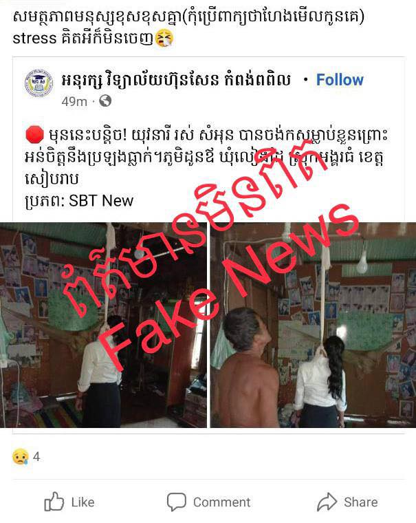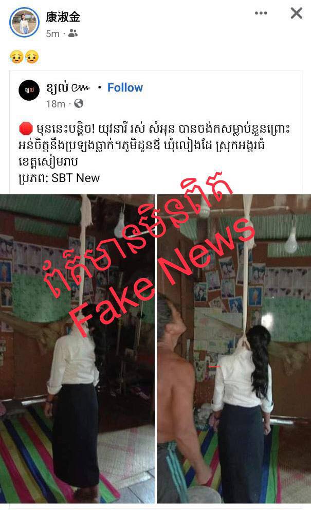 រដ្ឋបាលខេត្ត មានកិត្តិយសសូមគោរពជម្រាបជូនដល់សាធារណជនមេត្តាជ្រាបថា៖ នាថ្ងៃទី២៣ ខែធ្នូ ឆ្នាំ២០២២ មានគណនីហ្វេសប៊ុកឈ្មោះ អនុរក្សវិទ្យាល័យ ហ៊ុន សែន កំពង់ពពិល គណនីហ្វេសប៊ុក ឈ្មោះ ខ្យល់ និងគណនីបណ្ដាញសង្គមមួយចំនួនទៀត បានផ្សព្វផ្សាយថា មានយុវនារីឈ្មោះ រស់ សំអុន បានចងកសម្លាប់ខ្លួន ព្រោះអន់ចិត្តនឹងប្រឡងធ្លាក់ ភូមិដូនឪ ឃុំលាងដៃ ស្រុកអង្គរធំ។