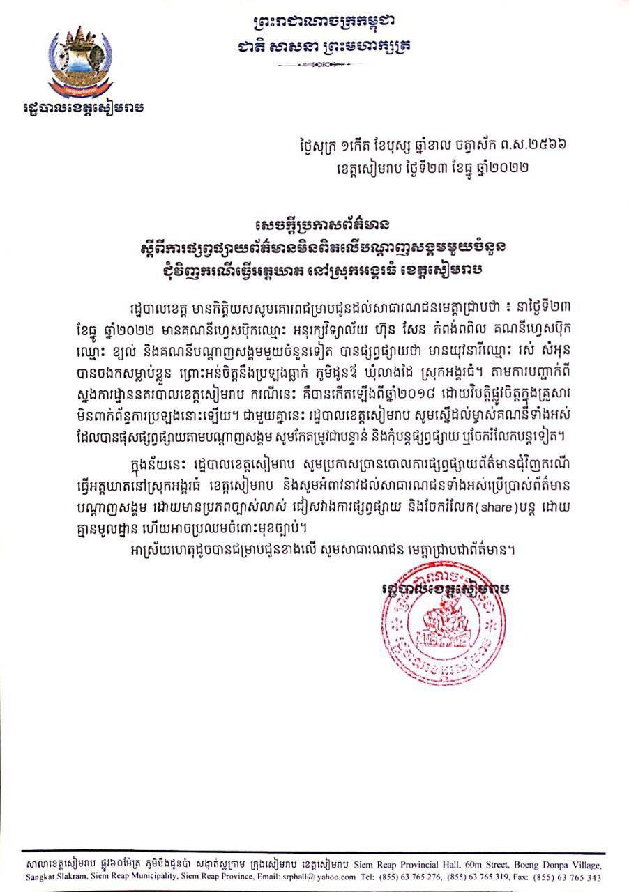 ខេត្តសៀមរាប៖ យោងតាមការចុះផ្សាយរបស់ រដ្ឋបាលខេត្តសៀមរាប នៅថ្ងៃទី២៣ ខែធ្នូ ឆ្នាំ២០២២ បានចេញសេចក្តីប្រកាសព័ត៌មានស្តីពីការផ្សព្វផ្សាយព័ត៌មានមិនពិតលើបណ្តាញសង្គមមួយចំនួន ជុំវិញករណីធ្វើអត្តឃាត នៅស្រុកអង្គរធំ ខេត្តសៀមរាប។