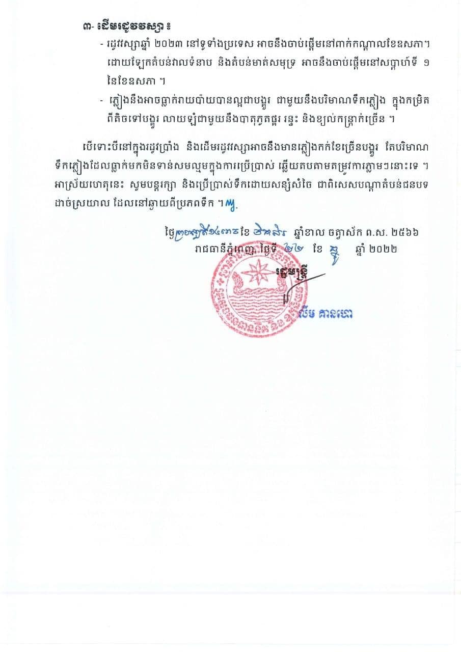 បើទោះបីនៅក្នុងរដូវប្រាំង និងដើមរដូវវស្សាអាចនឹងមានភ្លៀងកក់ខែច្រើនបង្គួរ តែបរិមាណ ទឹកភ្លៀងដែលធ្លាក់មកមិនទាន់សមល្មមក្នុងការប្រើប្រាស់ ឆ្លើយតបតាមតម្រូវការភ្លាមៗនោះទេ ។ អាស្រ័យហេតុនេះ សូមបន្តរក្សា និងប្រើប្រាស់ទឹកដោយសន្សំសំចៃ ជាពិសេសបណ្ដាតំបន់ជនបទ ដាច់ស្រយាល ដែលនៅឆ្ងាយពីប្រភពទឹក ៕