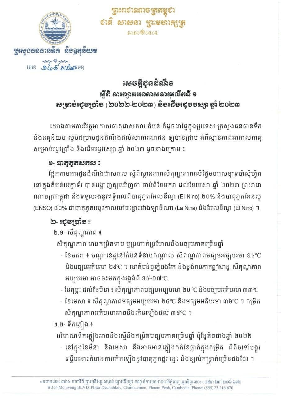 ដោយយោងតាមការវិវត្តអាកាសធាតុជាសកល តំបន់ ក៏ដូចជាផ្ទៃក្នុងប្រទេស ក្រសួងធនធានទឹក និងឧតុនិយម សូមជម្រាបជូនដំណឹងដល់សាធារណជន ឲ្យបានជ្រាប អំពីស្ថានភាពអាកាសធាតុ សម្រាប់រដូវប្រាំង និងដើមរដូវវស្សា ឆ្នាំ ២០២៣ ដូចខាងក្រោម៖