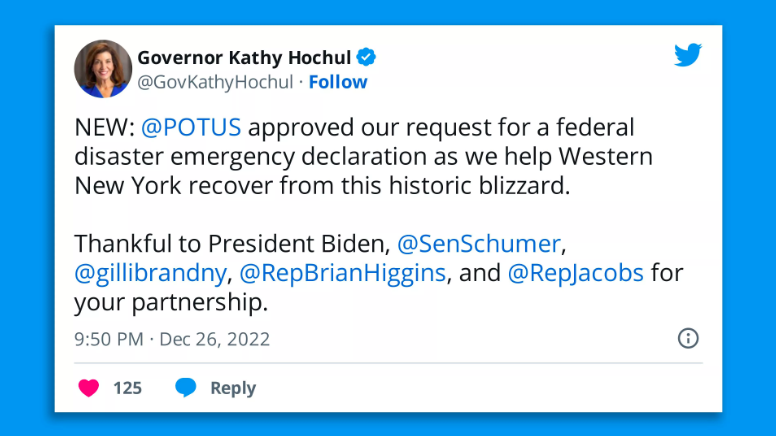 សេចក្តីថ្លែងការណ៍បានបន្ថែមថា សកម្មភាពរបស់លោក បៃដិន អនុញ្ញាតឱ្យនាយកដ្ឋានសន្តិសុខមាតុភូមិ (DHS) ទីភ្នាក់ងារគ្រប់គ្រងគ្រាអាសន្នសហព័ន្ធ (FEMA) ដើម្បីសម្របសម្រួលកិច្ចខិតខំប្រឹងប្រែងទាំងអស់ ជាមួយនឹង «គោលបំណងនៃការសម្រាលភាពលំបាក និងការឈឺចាប់ ដែលបណ្តាលមកពីគ្រោះអាសន្នលើប្រជាជនក្នុងតំបន់ និងផ្តល់ជំនួយសមរម្យសម្រាប់វិធានការសង្គ្រោះបន្ទាន់ដែលត្រូវការ»។ រំលឹកដែរថា យ៉ាងហោចណាស់មនុស្ស ២៧ នាក់ នៅក្នុងទីក្រុង Buffalo ត្រូវបានបញ្ជាក់ថាបានស្លាប់ នៅក្នុងអ្វីដែលលោកស្រី Hochul បានពិពណ៌នាថាជា «ព្យុះបំផ្លិចបំផ្លាញបំផុតនៅក្នុងប្រវត្តិសាស្ត្រដ៏យូរលង់របស់ទីក្រុង Buffalo»៕