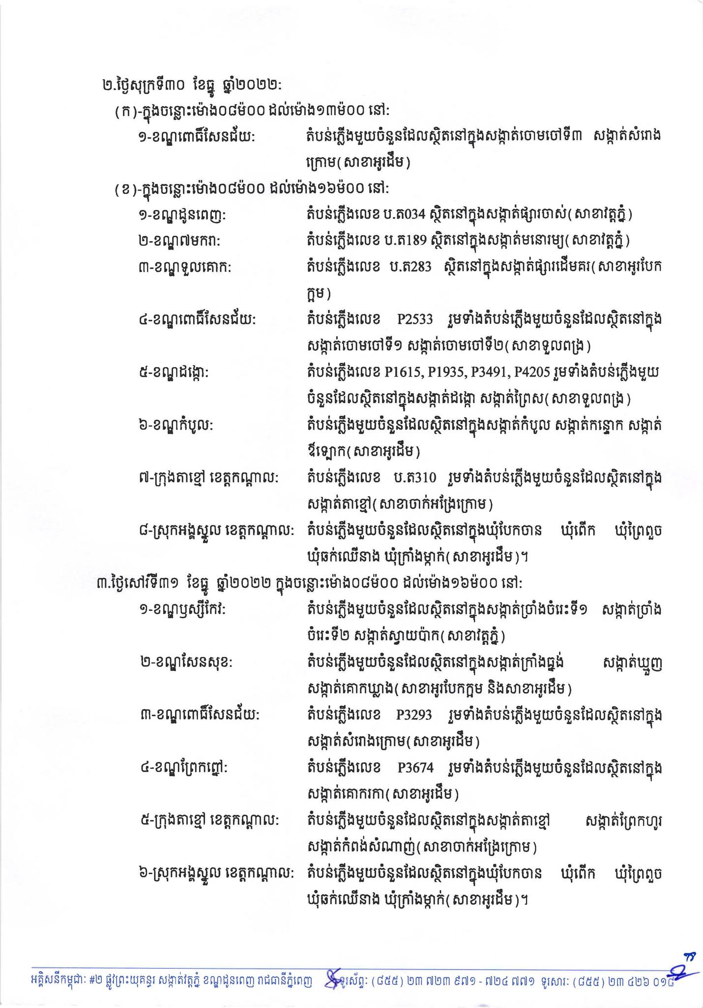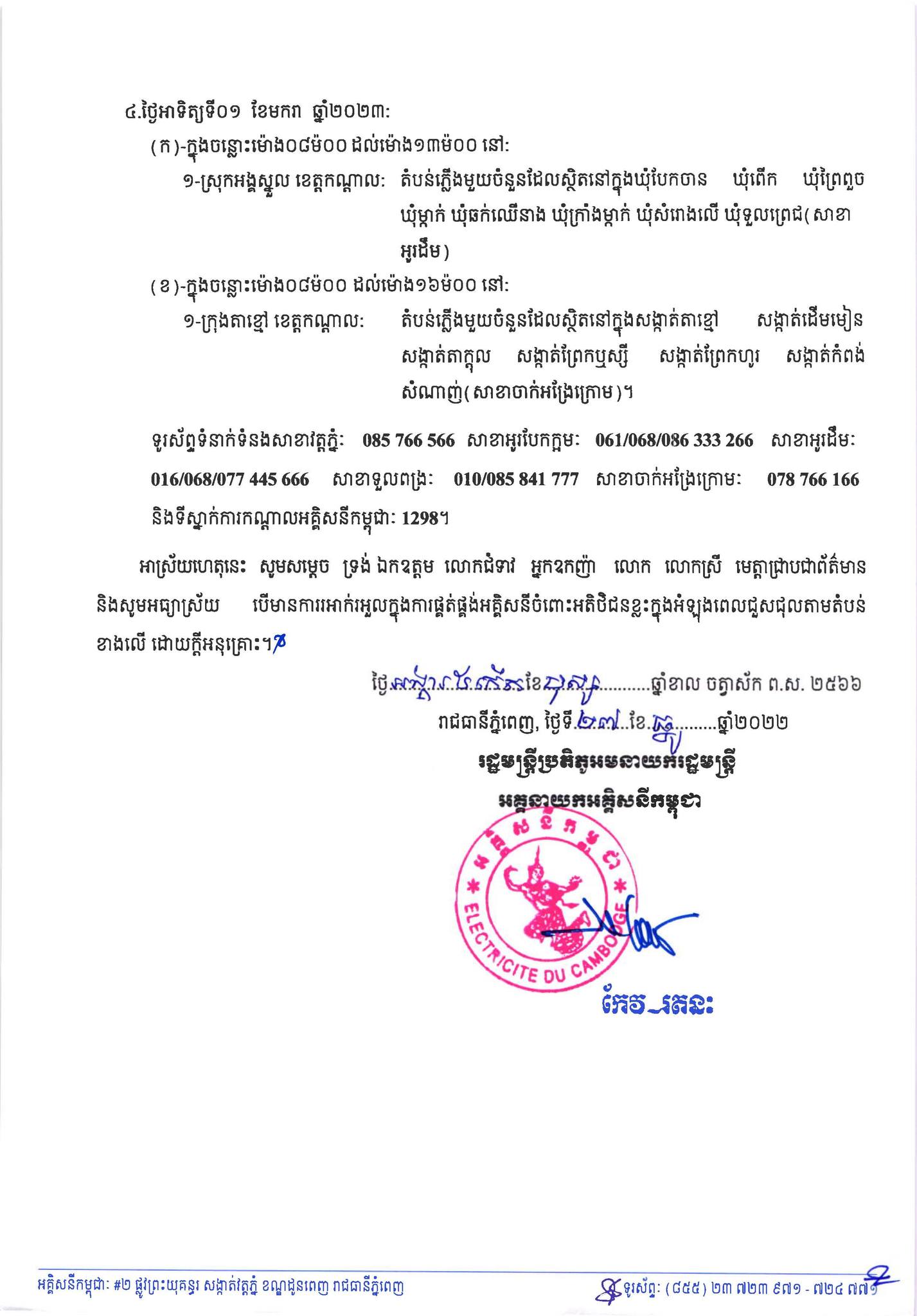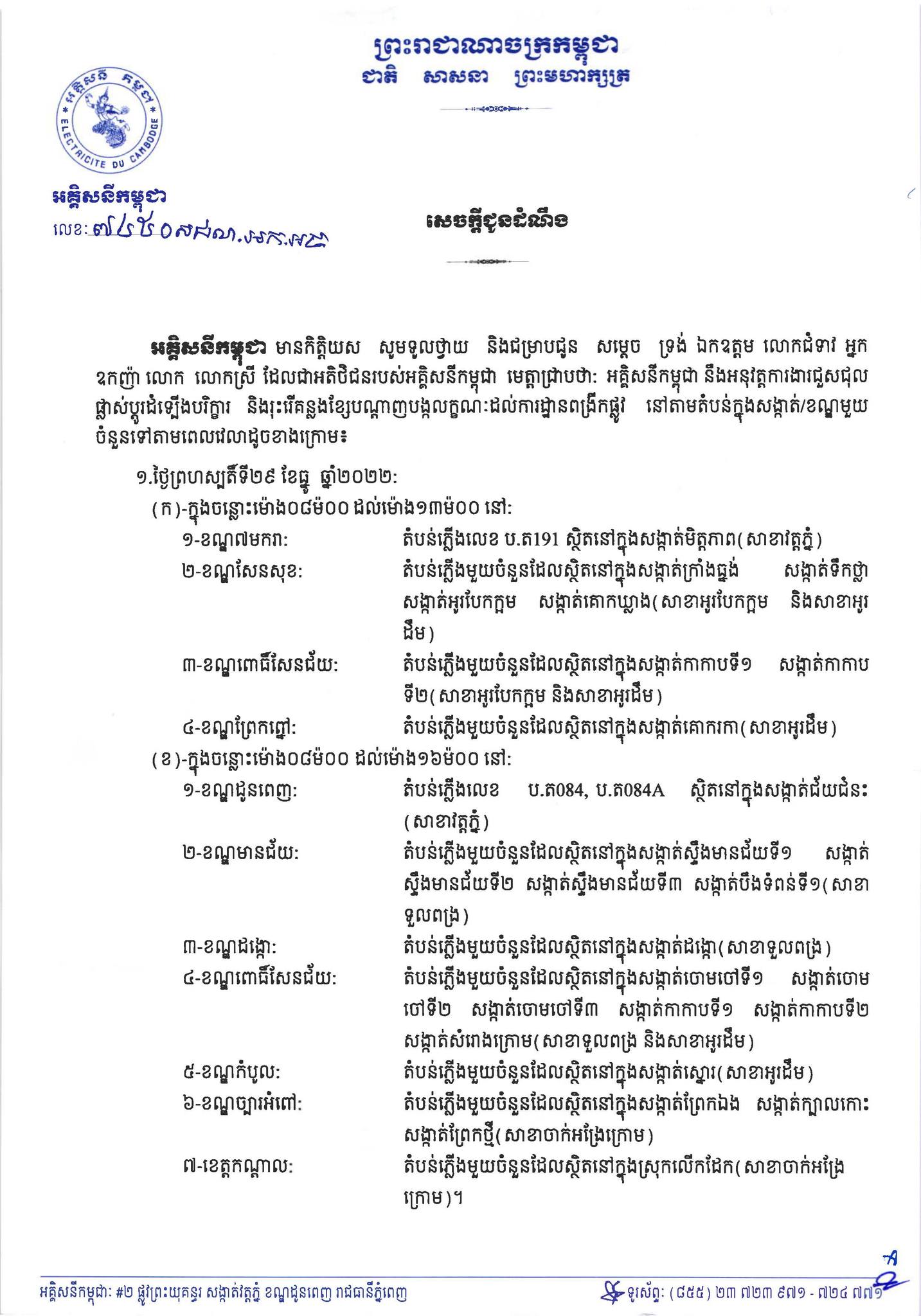 រាជធានីភ្នំពេញ៖ យផោងតាមការចុះផ្សាយរបស់ អគ្គិសនីកម្ពុជា នៅថ្ងៃទី២៨ ខែធ្នូ ឆ្នាំ២០២២ បានចេញសេចក្តីជូនដំណឹងស្តីពីការអនុវត្តការងារជួសជុល ផ្លាស់ប្តូរតម្លើងបរិក្ខារនានា និងរុះរើគន្លងខ្សែបណ្តាញអគ្គិសនីរបស់អគ្គិសនីកម្ពុជា ដើម្បីបង្កលក្ខណៈងាយស្រួលដល់ការដ្ឋានពង្រីកផ្លូវ នៅថ្ងៃទី២៩ ខែធ្នូ ឆ្នាំ២០២២ ដល់ថ្ងៃទី០១ ខែមករា ឆ្នាំ២០២២ នៅតំបន់មួយចំនួនទៅតាមពេលវេលា និងទីកន្លែងដូចសេចក្តីជូនដំណឹងលម្អិតខាងក្រោម។