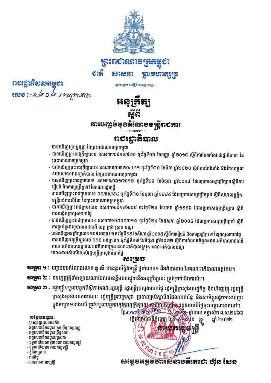 ការដកតំណែងនេះ ធ្វើឡើងតបតាមសំណើរបស់ សម្តេចក្រឡាហោម ស ខេង ឧបនាយករដ្ឋមន្ត្រី រដ្ឋមន្ត្រីក្រសួងមហាផ្ទៃ ៕