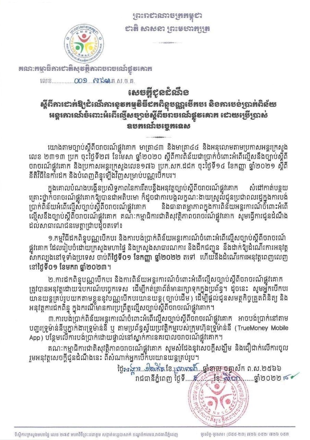 ក្នុងគោលបំណងបង្កើនប្រសិទ្ធភាពនៃការរឹតបន្តឹងអនុវត្តច្បាប់ស្ដីពីចរាចរណ៍ផ្លូវគោក សំដៅកាត់បន្ថយគ្រោះថ្នាក់ចរាចរណ៍ផ្លូវគោកឱ្យបានជាអតិបរមា កម្មវិធីដកពិន្ទុបណ្ណបើកបរ និងការបង់ប្រាក់ពិន័យអន្តរការណ៍ចំពោះអំពើល្មើសច្បាប់ស្ដីពីចរាចរណ៍ផ្លូវគោក នឹងដាក់ឱ្យដំណើរការអនុវត្តពេញលេញជាផ្លូវការ ចាប់ពីថ្ងៃទី០១ ខែមករា ឆ្នាំ២០២៣ នេះតទៅ។