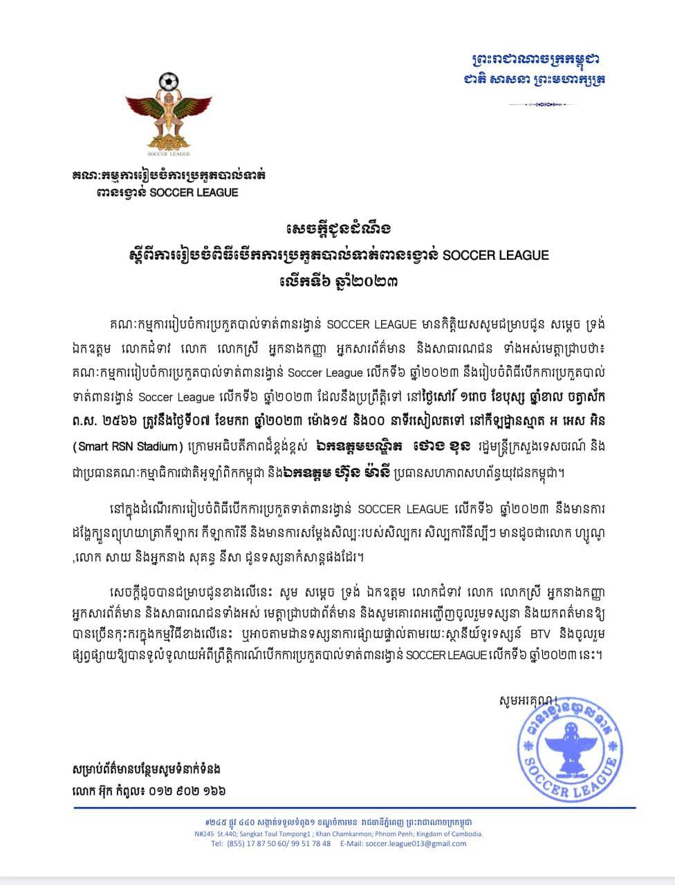 សេចក្តីដូចបានជម្រាបជូនខាងលើនេះ សូម សម្តេច ទ្រង់ ឯកឧត្តម លោកជំទាវ លោក លោកស្រី អ្នកនាងកញ្ញា អ្នកសារព័ត៌មាន និងសាធារណជនទាំងអស់ មេត្តាជ្រាបជាព័ត៌មាន និងសូមគោរពអញ្ជើញចូលរួមទស្សនា និងយកពត៌មានឱ្យ បានច្រើនកុះករក្នុងកម្មវិធីខាងលើនេះ ឬអាចតាមដានទស្សនាការផ្សាយផ្ទាល់តាមរយៈស្ថានីយ៍ទូរទស្សន៍ BTV និងចូលរួម ផ្សព្វផ្សាយឱ្យបានទូលំទូលាយអំពីព្រឹត្តិការណ៍បើកការប្រកួតបាល់ទាត់ពានរង្វាន់ SOCCER LEAGUE លើកទី៦ ឆ្នាំ២០២៣ នេះ ៕