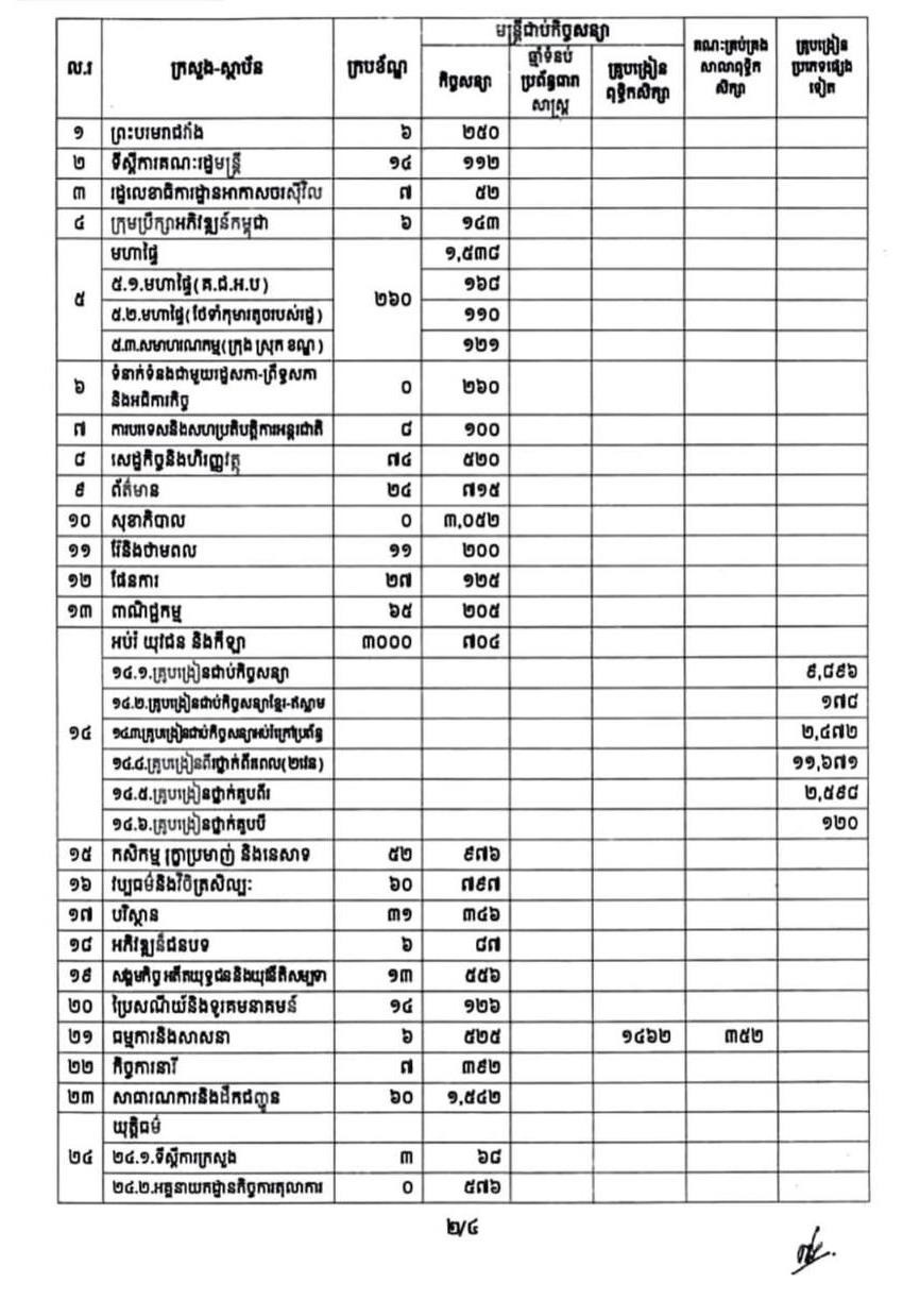 យោងតាមលិខិតរបស់រដ្ឋមន្ដ្រីក្រសួងមុខងារសាធារណៈ បានបញ្ជាក់ថា រាជរដ្ឋាភិបាល បានយល់ព្រមផ្ដល់ជាគោលការណ៍ ជ្រើសរើសក្របខ័ណ្ឌមន្ត្រីរាជការស៊ីវិលចំនួន ៣,៨៦៣នាក់, មន្ត្រីជាប់កិច្ចសន្យាចំនួន ១៧,០២៤នាក់, មន្ត្រីឆ្មាំទំនប់ប្រព័ន្ធធារាសាស្ត្រ ជាប់កិច្ចសន្យាចំនួន២៥០នាក់, គ្រូបង្រៀនពុទ្ធិកសិក្សាជាប់កិច្ចសន្យាចំនួន ១,៤៦២អង្គ/នាក់, គណៈគ្រប់គ្រងពុទ្ធិកសិក្សាចំនួន ៣៥២អង្គ/នាក់, គ្រូបង្រៀនជាប់កិច្ចសន្យា ចំណេះដឹងទូទៅចំនួន ៩,៨៩៦នាក់, គ្រូបង្រៀនជាប់កិច្ចសន្យាខ្មែរ-ឥស្លាមចំនួន ១៧៨នាក់, គ្រូបង្រៀនជាប់កិច្ចសន្យាអប់រំក្រៅប្រព័ន្ធចំនួន ២,៤៧២នាក់, គ្រូបង្រៀនពីរថ្នាក់ពីរពេល (២វេន)ចំនួន ១១,៦៧១នាក់, គ្រូបង្រៀនថ្នាក់គួបពីរចំនួន ២,៥៩៨នាក់ និងគ្រូបង្រៀនថ្នាក់គួបបី ចំនួន ១២០នាក់ សម្រាប់ឆ្នាំ២០២៣៕