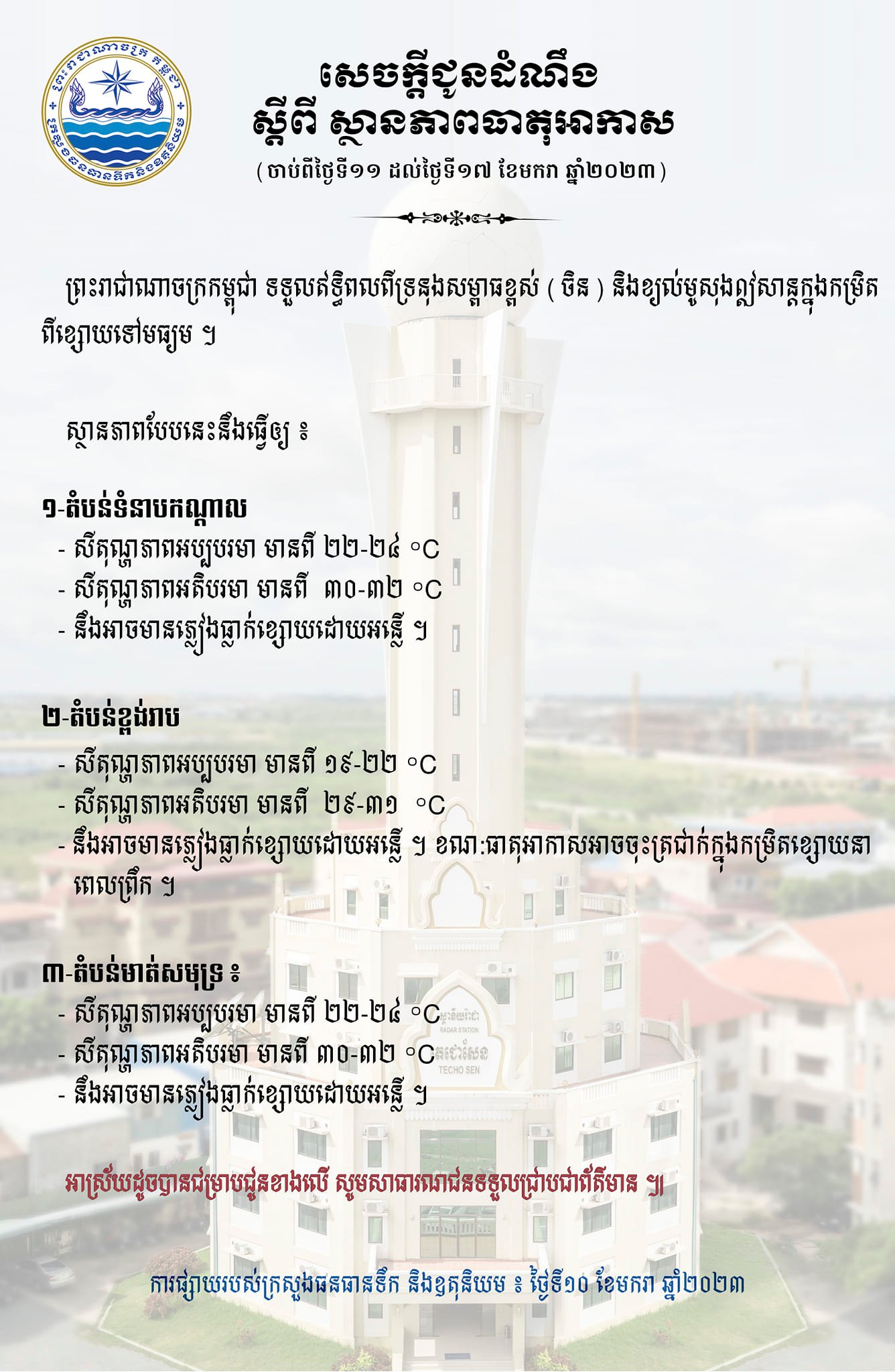 រាជធានីភ្នំពេញ៖ យោងតាមការចុះផ្សាយរបស់ ក្រសួងធនធានទឹក និងឧតុនិយម នៅថ្ងៃទី១០ ខែមករា ឆ្នាំ២០២៣ បានចេញសេចក្ដីជូនដំណឹងស្ដីពី ស្ថានភាពធាតុអាកាសចាប់ពីថ្ងៃទី១១ ដល់ថ្ងៃទី១៧ ខែមករា ឆ្នាំ២០២៣ ឱ្យបានជ្រាបថា៖