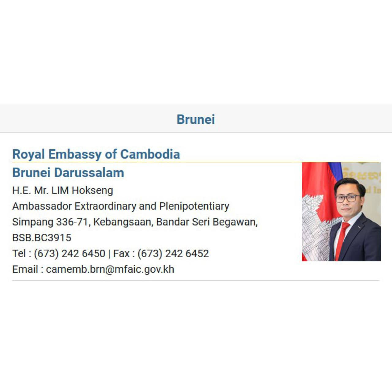 រាជធានីភ្នំពេញ៖ នៅថ្ងៃទី១២ ខែមករា ឆ្នាំ២០២៣ យោងតាមព្រះរាជក្រឹត្យ ព្រះករុណាព្រះបាទសម្តេចព្រះបរមនាថ នរោត្តម សីហមុនី ព្រះមហាក្សត្រនៃព្រះរាជាណាចក្រកម្ពុជា បានចេញព្រះរាជក្រឹត្យតែងតាំង ឯកឧត្ដម លឹម ហុកសេង ជា ឯកអគ្គរាជទូតកម្ពុជា ប្រចាំប្រទេសប្រ៊ុយណេ។