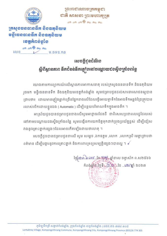ខេត្តកំពង់ឆ្នាំង៖ យោងតាមការចុះផ្សាយរបស់ មន្ទីរធនធានទឹក និងឧតុនិយមខេត្តកំពង់ឆ្នាំង នៅថ្ងៃទី១៣ ខែមករា ឆ្នាំ២០២៣ បានចេញសេចក្តីជូនដំណឹង ស្ដីពីស្ថានភាព ទឹកជំនន់ទឹកភ្លៀងនៅបណ្ដោយដងស្ទឹងក្រាំងពន្លៃ។