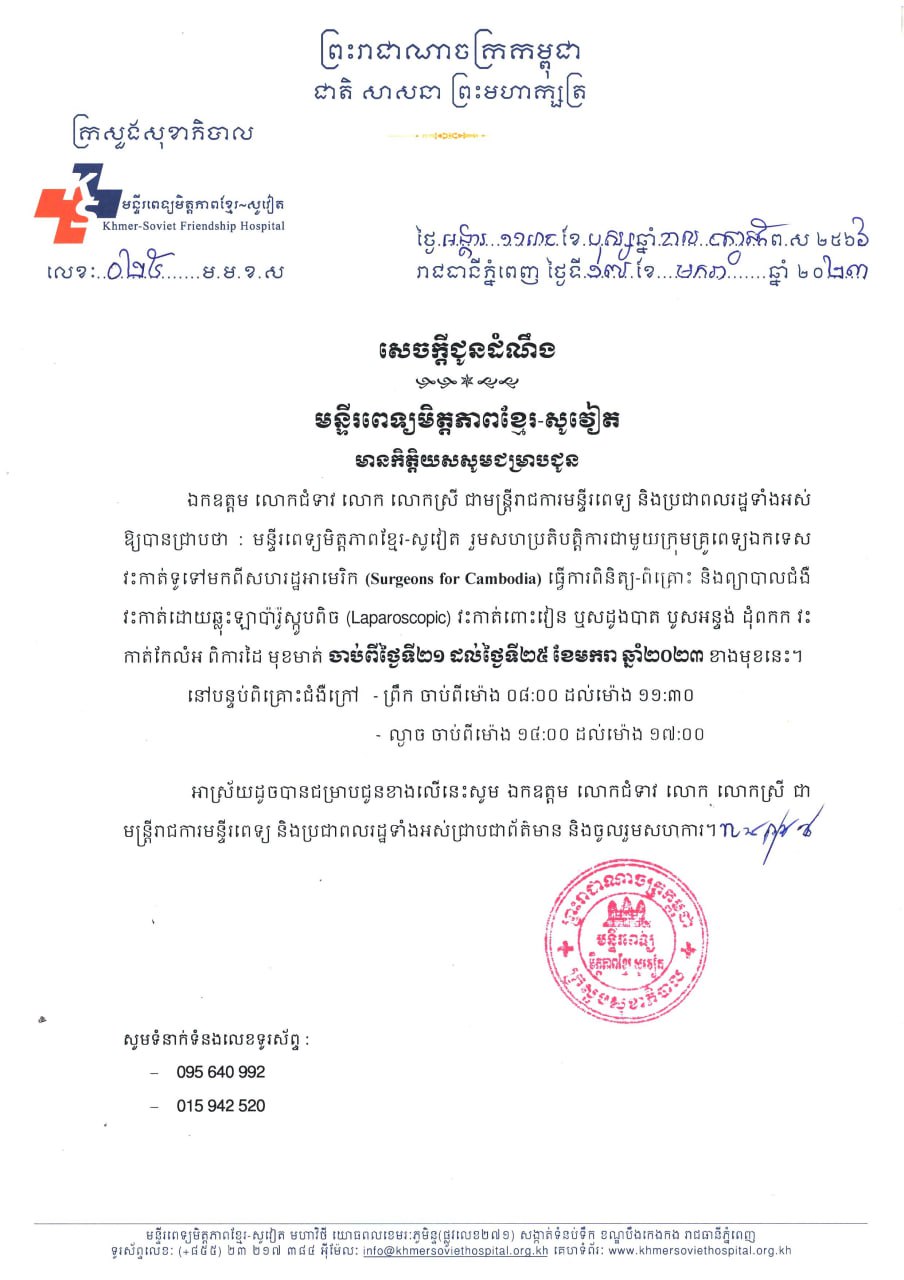 មន្ទីរពេទ្យមិត្តភាពខ្មែរ-សូវៀត រួមសហប្រតិបត្តិការជាមួយក្រុមគ្រូពេទ្យឯកទេស វះកាត់ទូទៅមកពីសហរដ្ឋអាមេរិក (Surgeons for Cambodia) ធ្វើការពិនិត្យ-ពិគ្រោះ និងព្យាបាលជំងឺ វះកាត់ដោយឆ្លុះឡាប៉ារ៉ូស្តូបពិច (Laparoscopic) វះកាត់ពោះវៀន ឬសដូងបាត បូសអន្ទង់ ដុំពកក វះ កាត់កែលំអ ពិការដៃ មុខមាត់ ចាប់ពីថ្ងៃទី២១ ដល់ថ្ងៃទី២៥ ខែមករា ឆ្នាំ២០២៣ ខាងមុខនេះ។