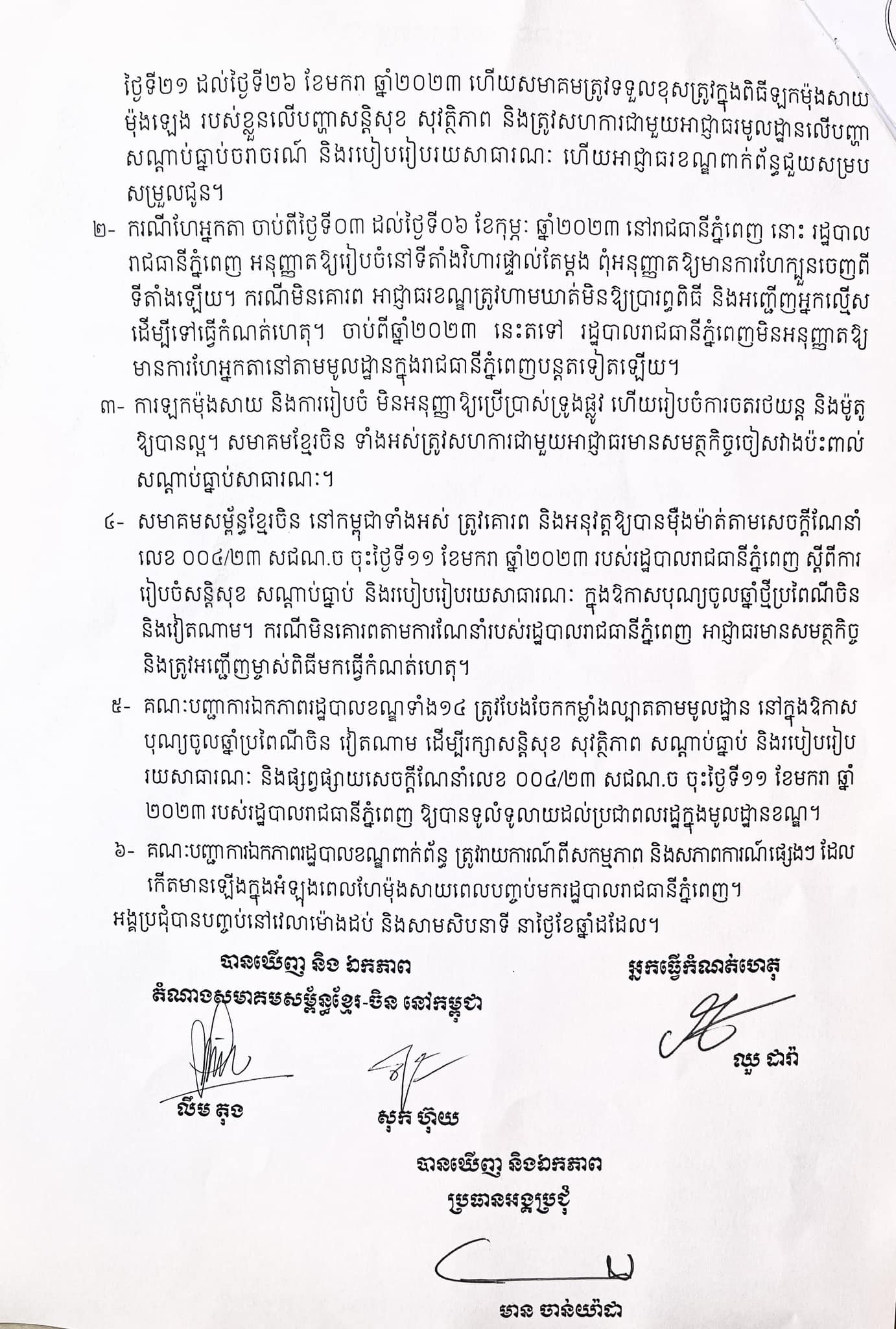 រាជធានីភ្នំពេញ៖ យោងតាមការចុះផ្សាយរបស់ រដ្ឋបាលរាជធានីភ្នំពេញ នៅថ្ងៃទី១៨ ខែមករា ឆ្នាំ២០២៣ បានចេញសេចក្ដីជូនដំណឹង ស្ដីពី កំណត់ហេតុប្រជុំ សំណើរសុំហែម៉ុងសាយ និងអ្នកតា ក្នុងឱកាសបុណ្យចូលឆ្នាំប្រពៃណីចិន វៀតណាម របស់សមាគមខ្មែរចិន នៅកម្ពុជា ចំនួន ០៥សមាគម។