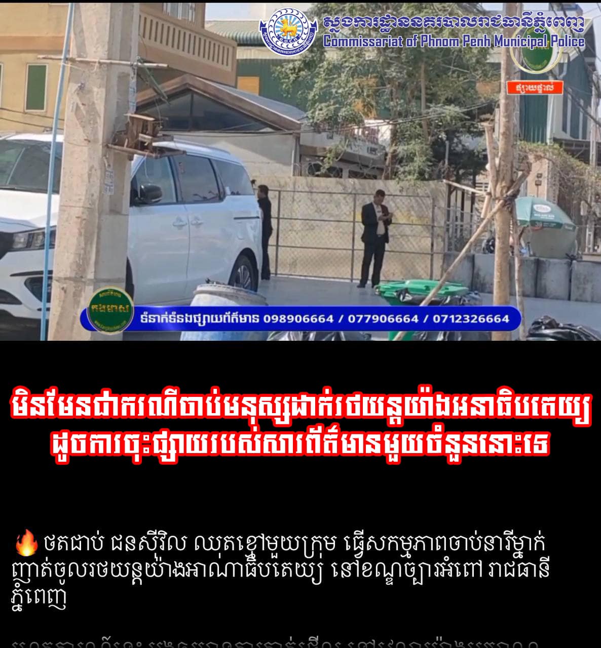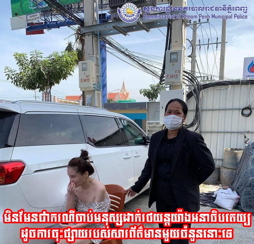 រាជធានីភ្នំពេញ៖ យោងតាមការចុះផ្សាយរបស់ ស្នងការដ្ឋាននគរបាលរាជធានីភ្នំពេញ នៅថ្ងៃទី២៣ ខែមករា ឆ្នាំ២០២៣ បានចេញសេចក្តីបកស្រាយបំភ្លឺរបស់ក្រុមការងារព័ត៌មាន និងប្រតិកម្មរហ័សនៃស្នងការដ្ឋាននគរបាលរាជធានីភ្នំពេញ ទាក់ទងទៅនឹងសារព័ត៌មានមួយបានផ្សព្វផ្សាយព័ត៌មានមិនពិត ដែលធ្វើឲ្យប៉ះពាល់ដល់សន្តិសុខសង្គម ដែលមានខ្លឹមសារទាំងស្រុងថា “ ថតជាប់ ជនស៊ីវិល ឈុតខ្មៅមួយក្រុម ធ្វើសកម្មភាពចាប់នារីម្នាក់ ញាត់ចូលរថយន្តយ៉ាងអនាធិបតេយ្យ នៅខណ្ឌច្បារអំពៅ រាជធានីភ្នំពេញ”។
