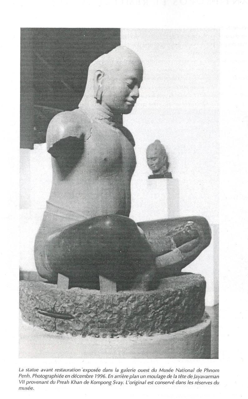 បំណែករូបព្រះបាទជ័យវម៌្មទី៧ រកឃើញដោយលោក Henri Marchal នាឆ្នាំ១៩២៤ ហើយបានយកមករក្សាទុកនៅអភិរក្សដ្ឋានអង្គរនៅឆ្នាំ១៩៣១។ ក្រោយមកលោក Georges Groslier បានដឹកយកមករក្សាទុកនៅសារមន្ទីរជាតិ និងផ្គុំឡើងវិញនៅចុងឆ្នាំ១៩៣៤។ លុះដល់ឆ្នាំ១៩៩៨ ក្រុមការងារអភិរក្ស និងជួសជុលនៃសារមន្ទីរជាតិសង្កេតឃើញថា ការផ្គុំភ្ជាប់ឡើងវិញនោះមិនត្រឹមត្រូវទេ ទើបសម្រេចរុះរើ និងអភិរក្សជួសជុលឡើងវិញតាមបទដ្ឋានបច្ចេកទេស រហូតបញ្ចប់ក្នុងឆ្នាំ១៩៩៩។