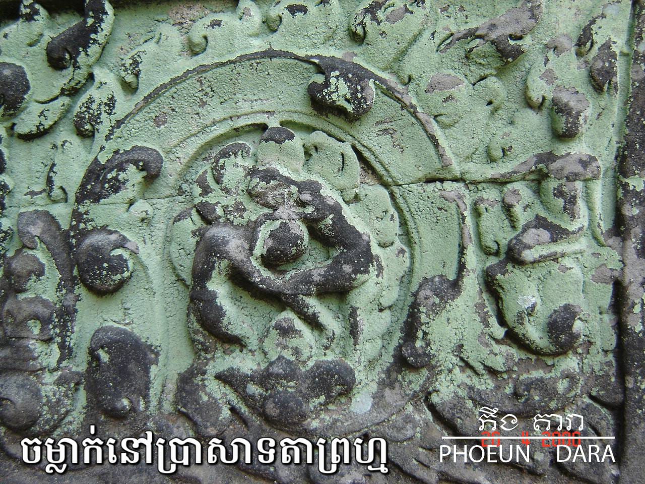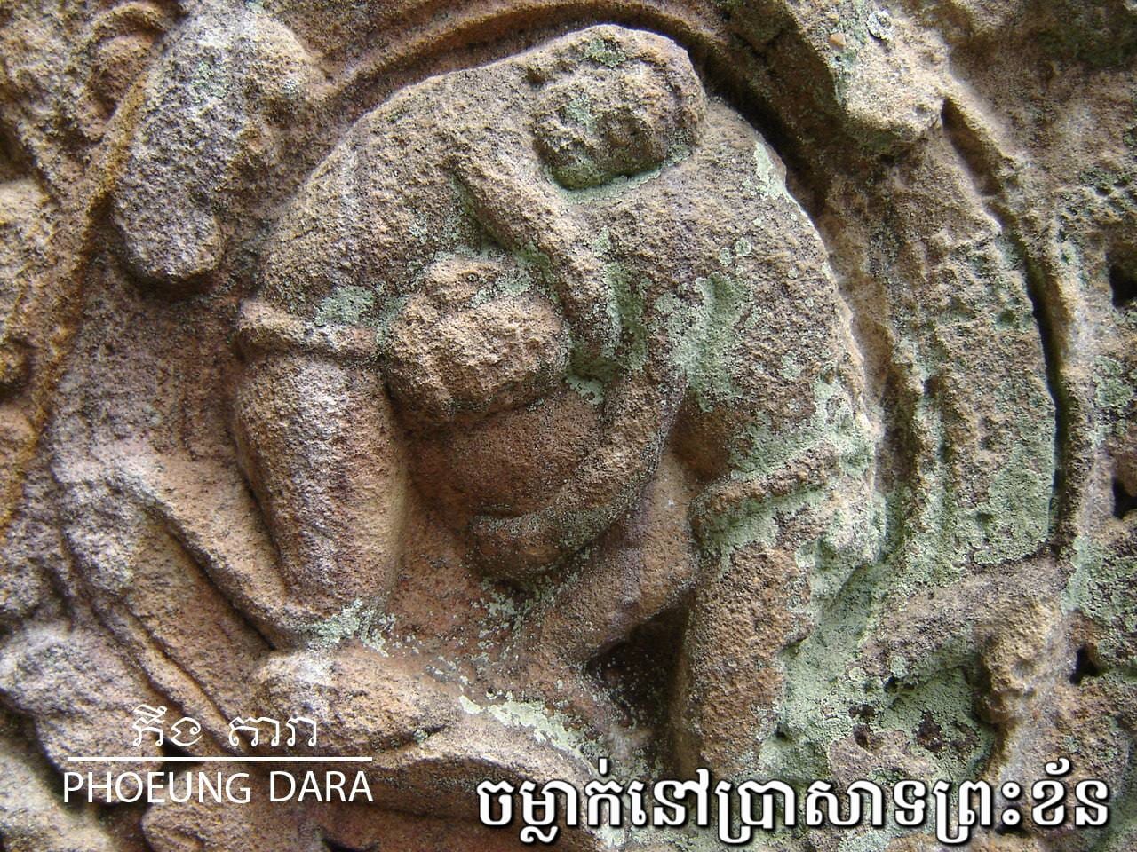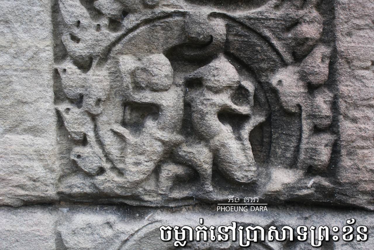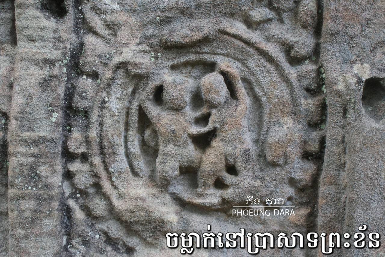 ចំណែកចម្លាក់នៅជញ្ជាំងប្រាសាទព្រះខ័នវិញ លោក ភឹង តារា ពន្យល់ថា គេឃើញនៅលើសសរផ្អោប ឃើញមានមនុស្សពីរនាក់ចាប់ឱបកាច់គ្នា ដោយអ្នកខាងឆ្វេងចាប់កាច់ កគូប្រកួតមកក្រោម តែអ្នកស្តាំនោះវិញក៏ខំឱបចាប់ភ្លៅដៃគូខ្លួនជាប់ ដើម្បីកុំឲ្យកាច់ផ្តួលខ្លួនបាន។ ដោយសារជាចម្លាក់ល្អិត ដូច្នេះចម្លាក់ទាំងនោះ ពុំសូវមានអ្នកស្គាល់ និងចាប់អារម្មណ៍ទេ។ ពួកគេតែងទៅ និងមកហួសជានិច្ច៕