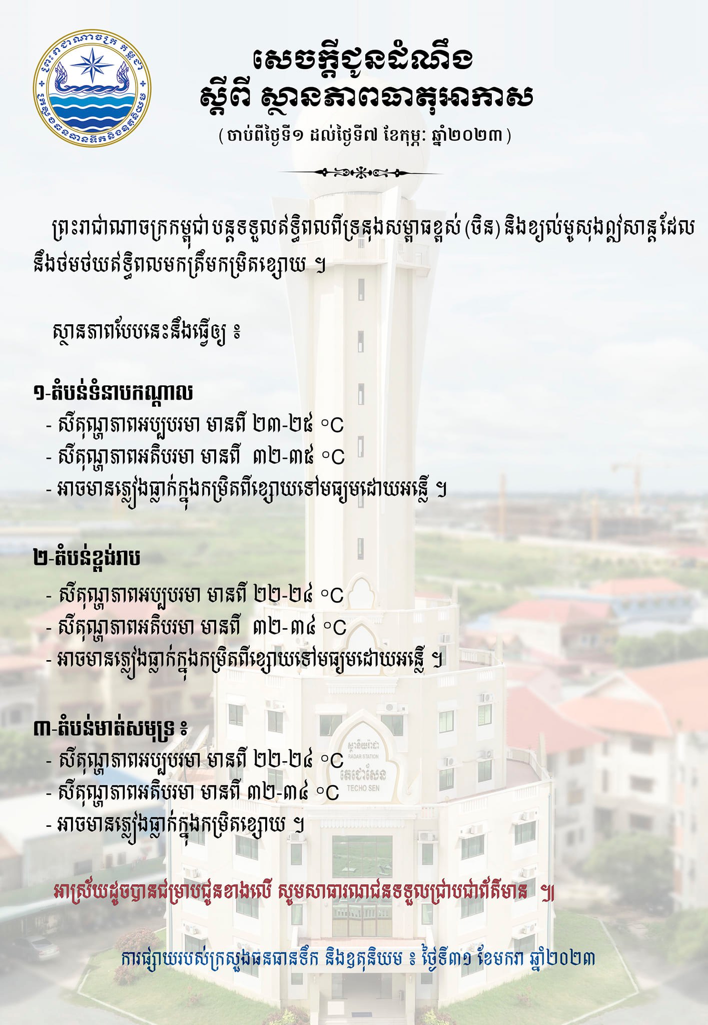 រាជធានីភ្នំពេញ៖ យោងតាមការចុះផ្សាយរបស់ ក្រសួងធនធានទឹក និងឧតុនិយម នៅថ្ងៃទី៣១ ខែមករា ឆ្នាំ២០២៣ បានចេញសេចក្ដីជូនដំណឹងស្ដីពី ស្ថានភាពធាតុអាកាស ចាប់ពីថ្ងៃទី០១ ដល់ថ្ងៃទី០៧ ខែកុម្ភៈ ឆ្នាំ២០២៣ បានឱ្យបានជ្រាបថា៖