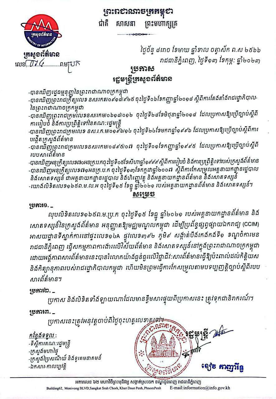 ក្រសួងព័ត៌មាន សម្រេចលុបលិខិតលេខ១៦៥ព.ម.ប.ក ចុះថ្ងៃទី១៥ ខែធ្នូ ឆ្នាំ២០២១ របស់អគ្គនាយកដ្ឋានព័ត៌មាន និង សោតទស្សន៍នៃក្រសួងព័ត៌មាន អនុញ្ញាតឱ្យមជ្ឈមណ្ឌលកម្ពុជា ដើម្បីប្រព័ន្ធផ្សព្វផ្សាយឯករាជ្យ (CCIM) អាសយដ្ឋានទីស្នាក់ការនៅផ្ទះលេខ១៤ ផ្លូវលេខ៣៩២ ភូមិ៩ សង្កាត់បឹងកេងកងទី១ ខណ្ឌចំការមន រាជធានីភ្នំពេញ ធ្វើសកម្មភាពការងារលើវិស័យព័ត៌មាន និងសោតទស្សន៍នៅក្នុងព្រះរាជាណាចក្រកម្ពុជា ដោយអង្គភាពសារព័ត៌មាននេះបានរំលោភយ៉ាងធ្ងន់ធ្ងរលើវិជ្ជាជីវៈសារព័ត៌មានធ្វើឱ្យប៉ះពាល់ដល់កិត្តិយស និងកិត្យានុភាពរបស់រាជរដ្ឋាភិបាលកម្ពុជា ហើយមិនព្រមធ្វើការកែសម្រួលតាមបទប្បញត្តិច្បាប់ស្ដីពីរបប សារព័ត៌មាន ៕