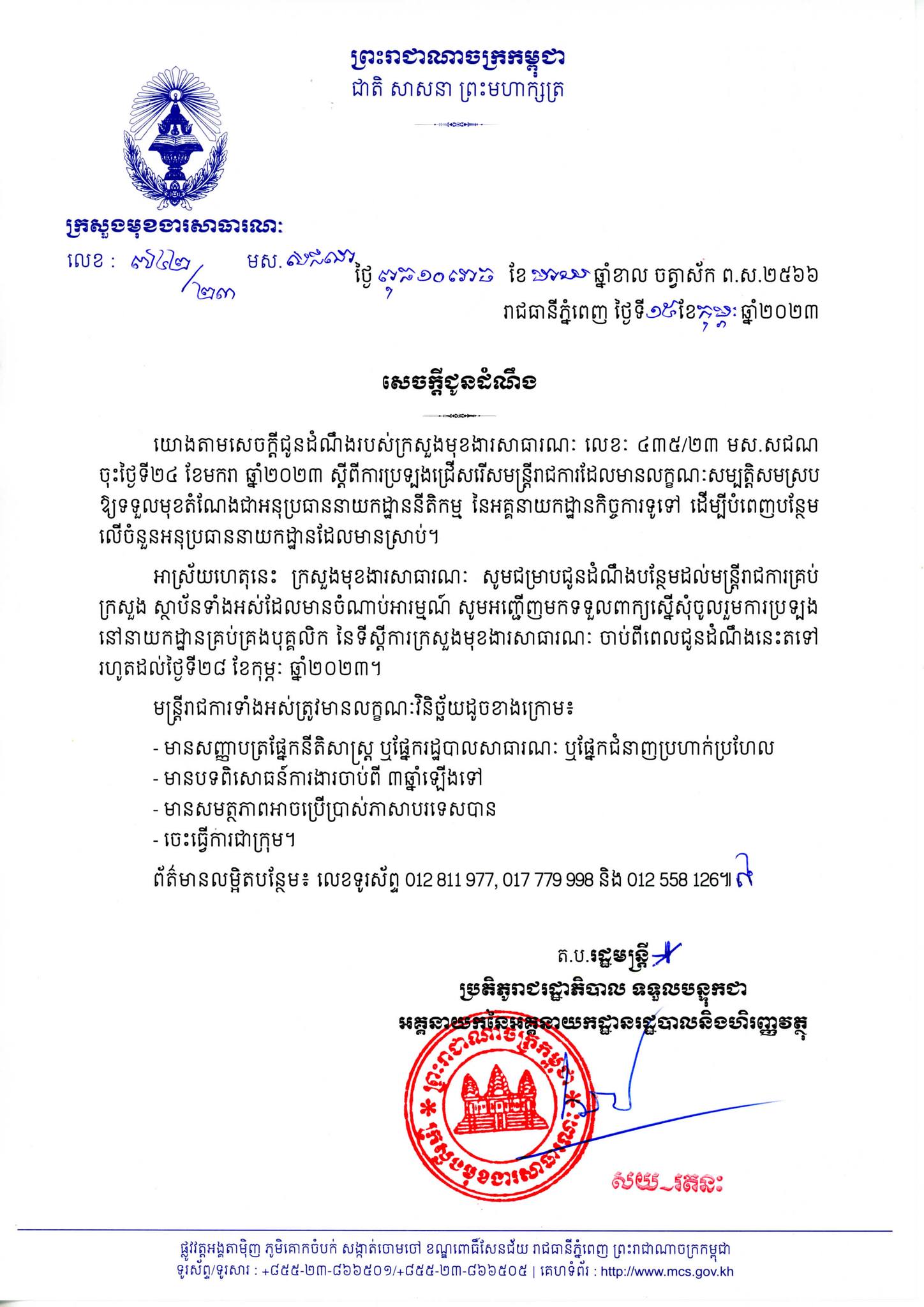 ក្រសួងមុខងារសាធារណៈ សូមជម្រាបជូនដំណឹងបន្ថែមដល់មន្ត្រីរាជការគ្រប់ ក្រសួង ស្ថាប័នទាំងអស់ដែលមានចំណាប់អារម្មណ៍ សូមអញ្ជើញមកទទួលពាក្យស្នើសុំចូលរួមការប្រឡង នៅនាយកដ្ឋានគ្រប់គ្រងបុគ្គលិក នៃទីស្តីការក្រសួងមុខងារសាធារណៈ ចាប់ពីពេលជូនដំណឹងនេះតទៅ រហូតដល់ថ្ងៃទី២៨ ខែកុម្ភៈ ឆ្នាំ២០២៣។