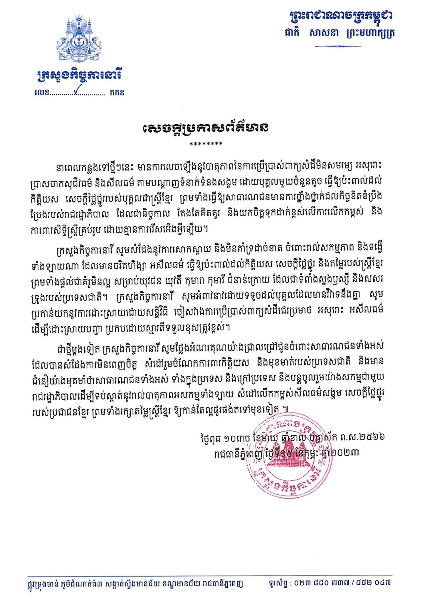 ក្រសួងកិច្ចការនារី សូមសំដែងនូវការសោកស្តាយ និងមិនគាំទ្រដាច់ខាត ចំពោះរាល់សកម្មភាព និងទង្វើ ទាំងឡាយណា ដែលមានចរិតហិង្សា អសីលធម៌ ធ្វើឱ្យប៉ះពាល់ដល់កិត្តិយស សេចក្តីថ្លៃថ្នូរ និងតម្លៃរបស់ស្ត្រីខ្មែរ ព្រមទាំងផ្តល់ជាគំរូមិនល្អ សម្រាប់យុវជន យុវតី កុមារា កុមារី ជំនាន់ក្រោយ ដែលជាទំពាំងស្នងឫស្សី និងសសរ ទ្រូងរបស់ប្រទេសជាតិ។